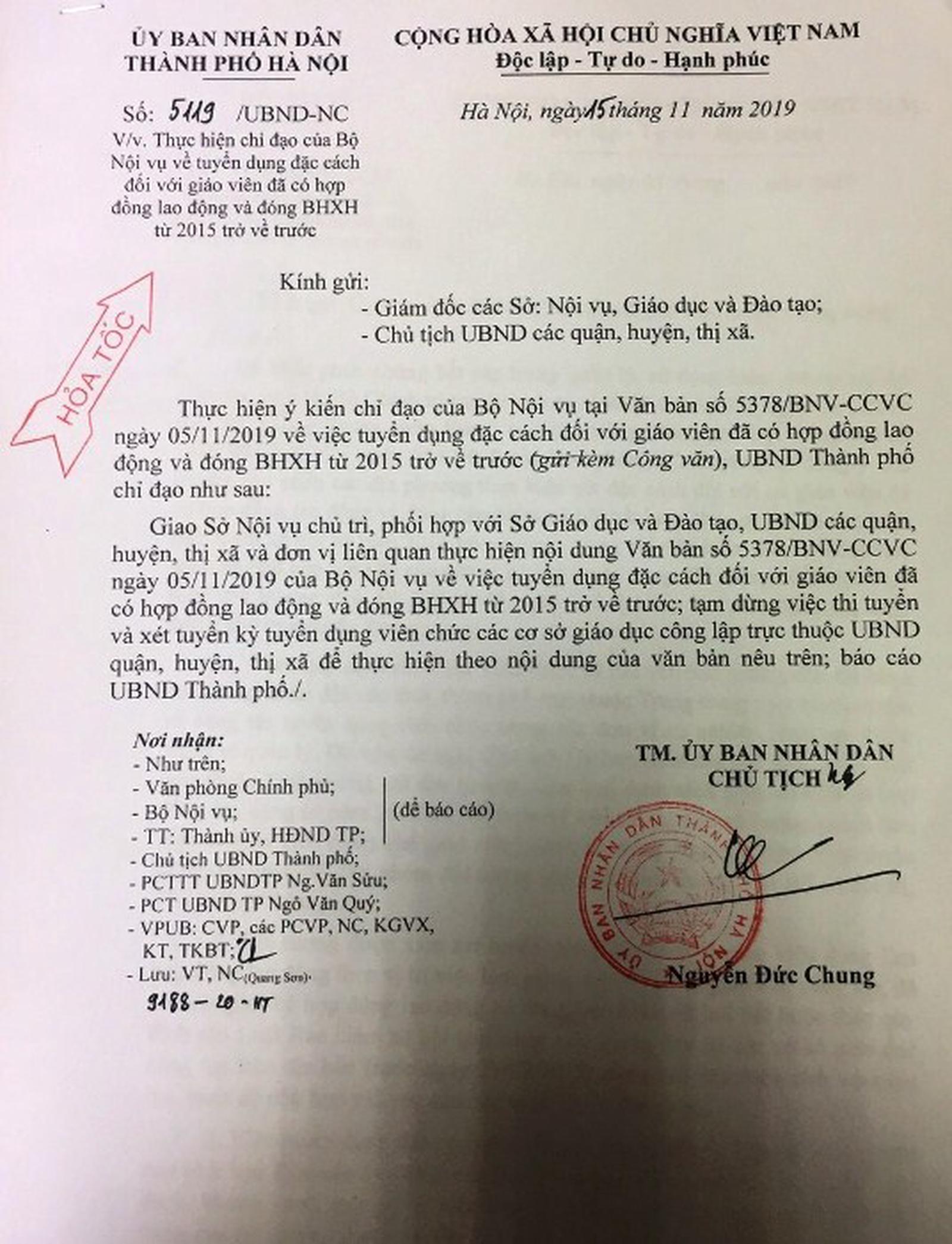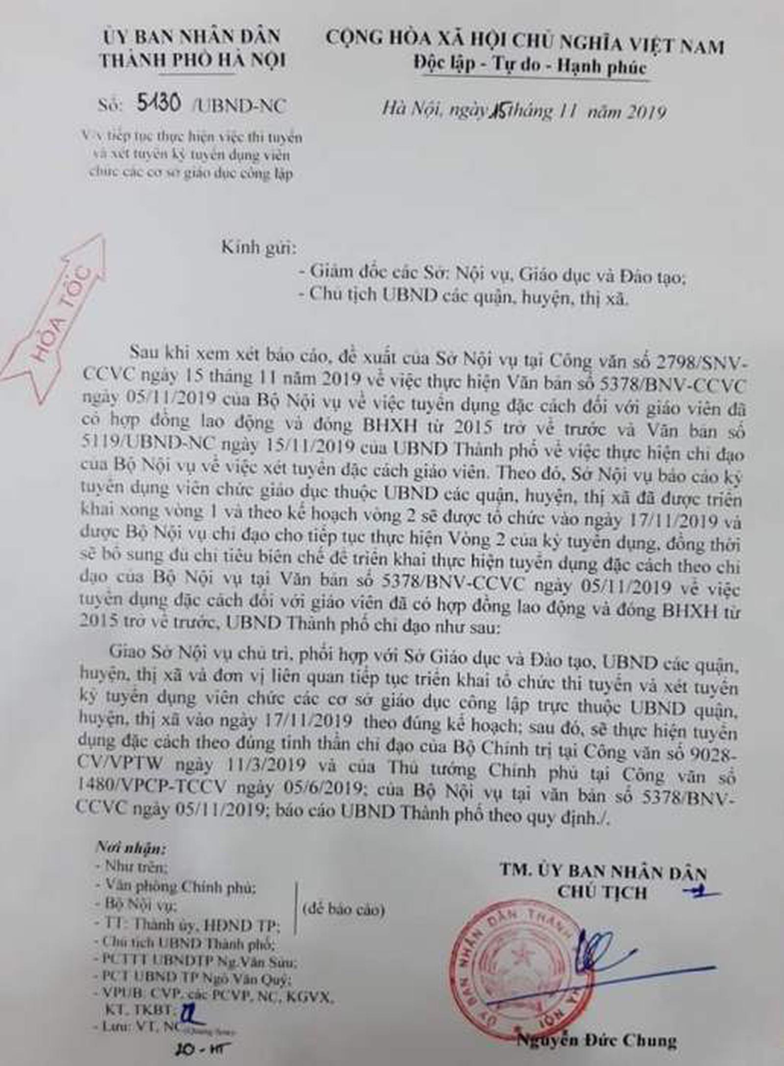 Văn bản hỏa tốc số 5130 về việc tiếp tục thực hiện thi tuyển và xét tuyển kỳ tuyển dụng viên chức các cơ sở giáo dục công lập cho biết, sau khi xem xét báo cáo, đề xuất của Sở Nội vụ tại Công văn số 2798 ngày 15/11/2019 về việc thực hiện Văn bản số 5378 của Bộ Nội vụ về việc tuyển dụng đặc cách đối với giáo viên đã có hợp đồng lao động và đóng BHXH từ 2015 trở về trước và Văn bản số 5119 ngày 15/11/2019 của UBND TP về việc thực hiện chỉ đạo của Bộ Nội vụ về việc xét tuyển đặc cách giáo viên.