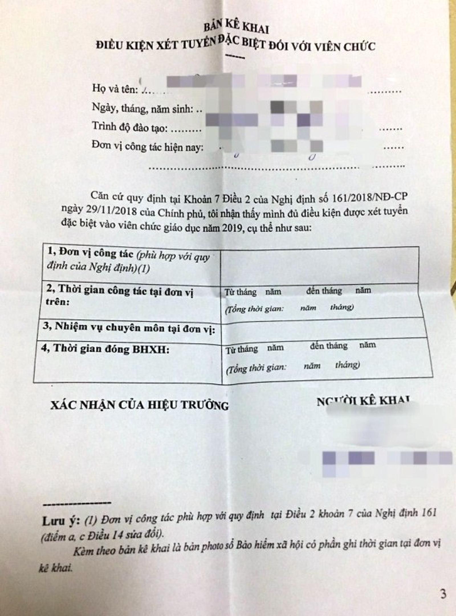 Trước đó, ngày 9/7, trong phiên chất vấn của HĐND TP Hà Nội, Chủ tịch UBND TP Nguyễn Đức Chung cho biết, sẽ xét đặc cách cho tất cả GVHĐ nếu đạt 3 điều kiện: Thứ nhất, giáo viên có hợp đồng và có đóng bảo hiểm ít nhất 5 năm trở lại đây. Thứ hai, có kiểm tra đảm bảo sức khỏe. Thứ ba, có năng lực, trình độ phù hợp với vị trí việc làm, tức là giáo viên phải dạy môn mà trường có nhu cầu tuyển dụng. Người đứng đầu TP cũng cho hay, tới đây, UBND TP sẽ thành lập hội đồng xét tuyển. Sau khi xét tuyển hết (số GVHĐ lâu năm) thì sẽ thi tuyển với số còn lại.Nhiều GVHĐ ở Sóc Sơn với tập bằng khen, giấy khen dầy trên tay, nhưng đang đứng trước nguy cơ mất việc vì kỳ thi tuyển viên chức sắp diễn ra. Ảnh: HHCách đó không lâu, UBND TP cũng ban hành quyết định về việc tuyển dụng đặc biệt đối với GVHĐ. Theo đó, TP giao UBND các quận, huyện, thị xã rà soát, thống kê số lượng giáo viên hiện đang hợp đồng lao động làm công tác giảng dạy tại các trường công lập trên địa bàn xem xét thực hiện việc tuyển dụng đặc biệt vào viên chức đối với những trường hợp cụ thể đủ điều kiện theo quy định của Chính phủ.… Thực hiện một nẻoLiên tiếp những động thái được cho là tích cực của UBND TP khiến GVHĐ “mừng rơi nước mắt”, nhưng “niềm vui ngắn chẳng tày ngang”, cũng trong ngày 9/7, tại cuộc họp giữa UBND huyện Sóc Sơn với tất cả 256 GVHĐ đang giảng dạy tại các trường tiểu học, THCS trên địa bàn thì những chỉ đạo được cho là “thấu tình, đạt lý” của UBND TP lại không được địa phương áp dụng. Tại cuộc họp với GVHĐ ngày 9/7, Phó Chủ tịch UBND huyện Sóc Sơn - ông Lê Hữu Mạnh thông tin, điều kiện để được xét tuyển đặc cách là vận dụng theo quy định hiện hành của pháp luật mà cụ thể là Nghị định 161/2018.Có giáo viên dành cả thanh xuân cống hiến cho ngành Giáo dục huyện nhà, chỉ còn 2 năm nữa là về hưu nhưng vẫn phải tham gia kỳ thi tuyển viên chức với các thí sinh bằng tuổi con, cháu. Kể về cuộc đời mình, những giọt nước mắt đã rơi... Ảnh: HHÔng Mạnh cho biết, theo Nghị định 161, để xét tuyển viên chức đặc biệt, giáo viên phải có ít nhất 5 năm công tác ở vị trí việc làm yêu cầu trình độ đào tạo đại học trở lên phù hợp với yêu cầu của vị trí việc làm cần tuyển dụng và có đóng bảo hiểm. Phân tích ở điểm này, ông Mạnh khẳng định, tất cả GVHĐ ở Sóc Sơn đều có 5 năm công tác, nhưng những giáo viên đang công tác ở bậc mầm non, tiểu học, THCS thì chỉ đòi hỏi bằng cấp trung cấp sư phạm, cao đẳng sư phạm chứ không phải đại học. Như vậy, nếu đang hợp đồng làm việc ở các bậc học này thì chắc chắn không phải đối tượng được xét đặc cách. Ngay điều kiện đầu tiên chúng ta đã không đủ. Ngoài ra, Điểm a, Khoản 1, điều 14, Nghị định 161 cũng quy định, trường hợp đặc biệt trong tuyển dụng viên chức phải là "người ký hợp đồng lao động theo đúng quy định của pháp luật làm công việc chuyên môn, nghiệp vụ trong đơn vị sự nghiệp công lập tự bảo đảm chi thường xuyên, chi đầu tư và đơn vị sự nghiệp công lập tự bảo đảm chi thường xuyên hoặc đơn vị sự nghiệp ngoài công lập". Đối chiếu với quy định này, ông Mạnh khẳng định, hiện nay tất cả các trường tiểu học, THCS, mầm non trên địa bàn TP Hà Nội nếu là công lập thì không có trường nào tự chủ, ít nhất là tự chủ chi thường xuyên. Hiện, Sóc Sơn trường tự chủ cao nhất mới là 20% chi thường xuyên. Với tiêu chí này, 256 GVHĐ ở Sóc Sơn tiếp tục không đạt. Bản rà soát kê khai điều kiện xét tuyển đặc biệt đối với viên chức được UBND huyện Sóc Sơn phát cho GVHĐ kê khai. Ảnh: HH Từ phân tích trên, ông Mạnh khẳng định, theo quy định của Nghị định 161, thì những GVHĐ ở Sóc Sơn không ai đủ tiêu chuẩn xét tuyển đặc cách cả. Ông Mạnh cũng cho rằng, số lượng đủ điều kiện, tiêu chuẩn để xét tuyển đặc biệt trên địa bàn TP Hà Nội sẽ có, nhưng rất ít. “Ngày 20/7, huyện sẽ đăng ký hình thức thi tuyển và cũng công bố danh sách những giáo viên đủ điều kiện xét tuyển đặc cách. Sau ngày 20/7, song song với tổ chức xét tuyển đặc biệt, TP sẽ công bố nội dung cách thức thi tuyển, xét tuyển để tất cả thí sinh chuẩn bị, phấn đấu tổ chức kỳ thi sớm nhất để đáp ứng yêu cầu, nhiệm vụ năm học mới” - ông Mạnh nói. Cũng tại buổi đối thoại với GVHĐ ngày 9/7, UBND huyện Sóc Sơn đã phát cho giáo viên bản rà soát kê khai điều kiện xét tuyển đặc biệt đối với viên chức. Theo bản rà soát này, căn cứ để xét đặc biệt được Sóc Sơn vận dụng chính là Nghị định 161. Những GVHĐ huyện Sóc Sơn cho rằng, 3 điều kiện mà Chủ tịch TP Hà Nội nói trong phiên chất vấn của HĐND TP Hà Nội thì mọi người đều đáp ứng đủ. Tuy nhiên, cấp thực hiện lại là UBND huyện Sóc Sơ