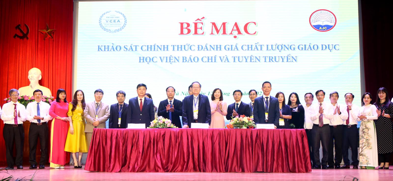 Kết thúc Lễ Bế mạc, PGS,TS Phạm Minh Sơn, Giám đốc Học viện và TS Nguyễn Đình Huy, Phó Giám đốc Trung tâm Kiểm định chất lượng giáo dục, Đại học Vinh; GS,TSKH Đặng Ứng Vận, Trưởng đoàn Khảo sát đánh giá chất lượng giáo dục Học viện Báo chí và Tuyên truyền đã ký kết biên bản hoàn thành đợt khảo sát chính thức đánh giá chất lượng giáo dục Học viện Báo chí và Tuyên truyền.