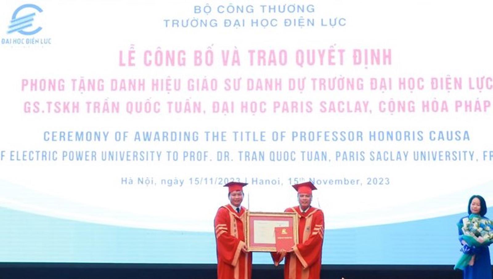 Cũng tại lễ bế mạc, PGS.TS Đinh Văn Châu đã đại diện Trường Đại học Điện lực trao quyết định phong tặng danh hiệu Giáo sư danh dự Trường Đại học Điện lực cho GS. TSKH Trần Quốc Tuấn.