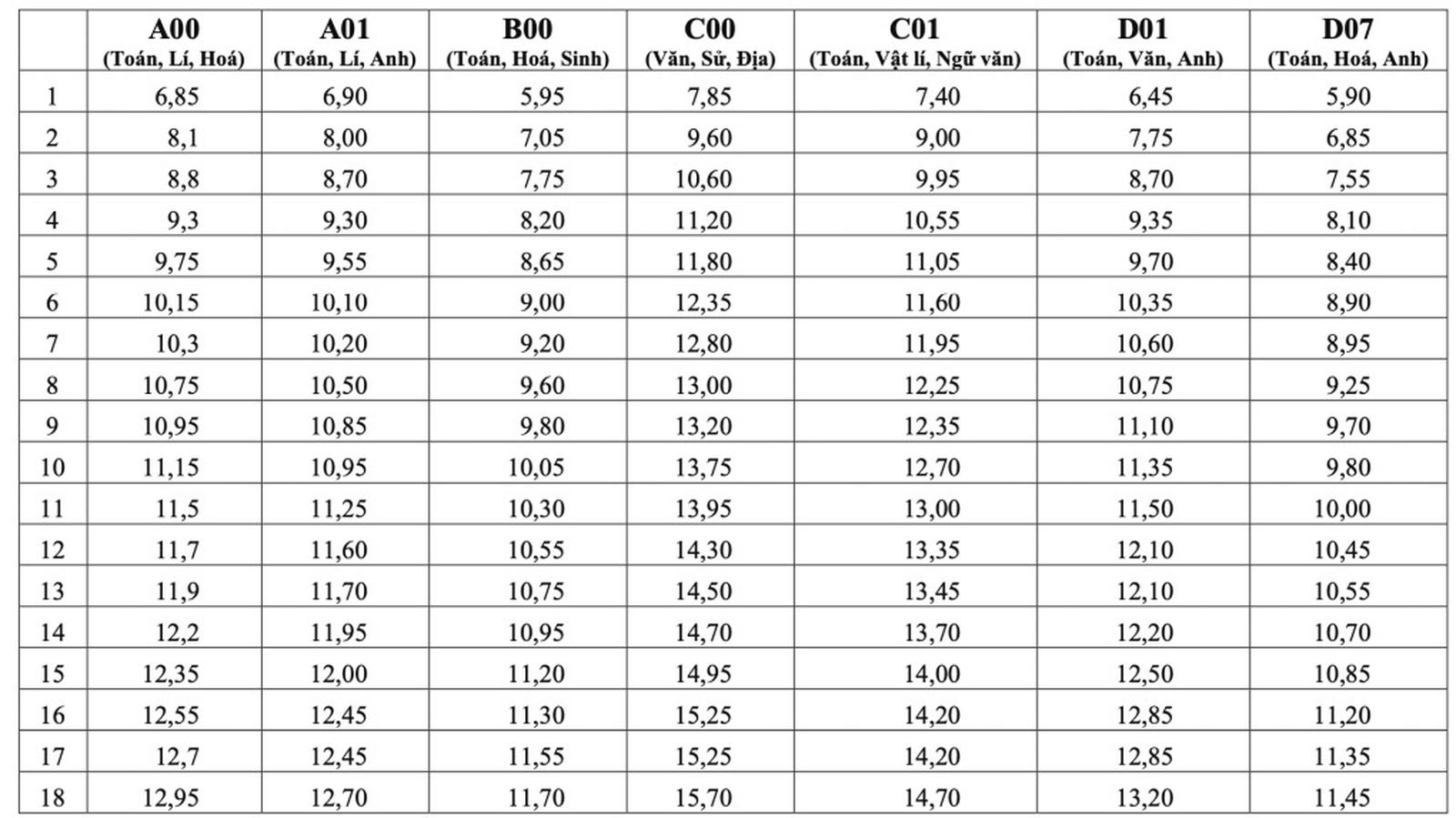 Sáng 22/7, Bộ GD&ĐT đã công bố bách phân vị của 7 tổ hợp truyền thống là: A00 (Toán, Lý, Hóa), A01 (Toán, Lý, Anh), B00 (Toán, Hóa, Sinh), C00 (Văn, Sử, Địa), D01 (Toán, Văn, Anh), C01 (Toán, Lý, Văn), D07 (Toán, Hóa, Anh).