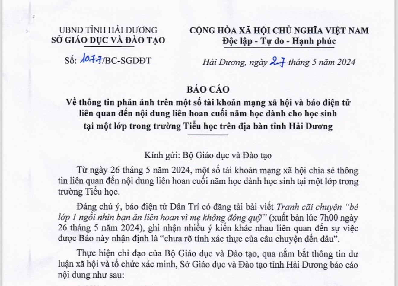 (Thanh tra) - Qua công tác nắm bắt dư luận xã hội, Bộ Giáo dục và Đào tạo đã tổ chức xác minh thông tin và đề nghị Sở Giáo dục và Đào tạo tỉnh Hải Dương báo cáo về trường hợp “bé lớp 1 phải ngồi nhìn các bạn ăn liên hoan vì mẹ không đóng quỹ” được chia sẻ trên mạng xã hội và được một tờ báo điện tử đăng tải thời gian qua.