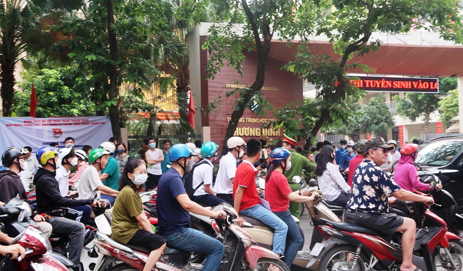 Từ sáng sớm, phụ huynh đưa con đi thi, tập trung đông ở cổng trường, khiến giao thông ùn tắc nhẹ, nhưng lực lượng chức năng đã nhanh chóng giải tỏa. Ảnh: HH