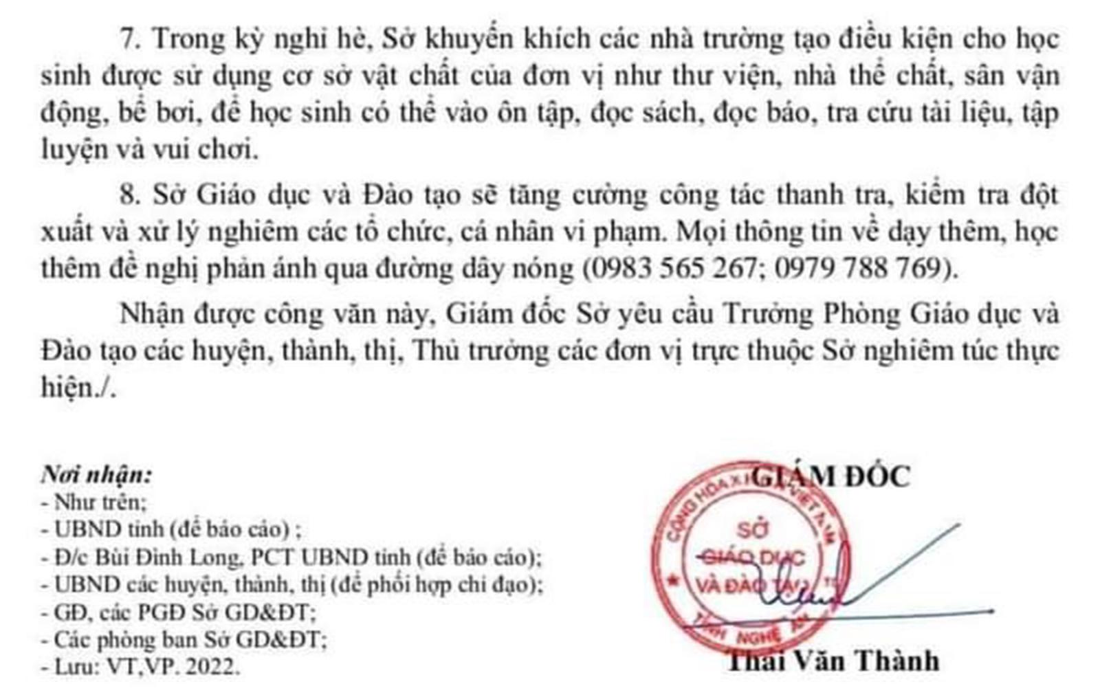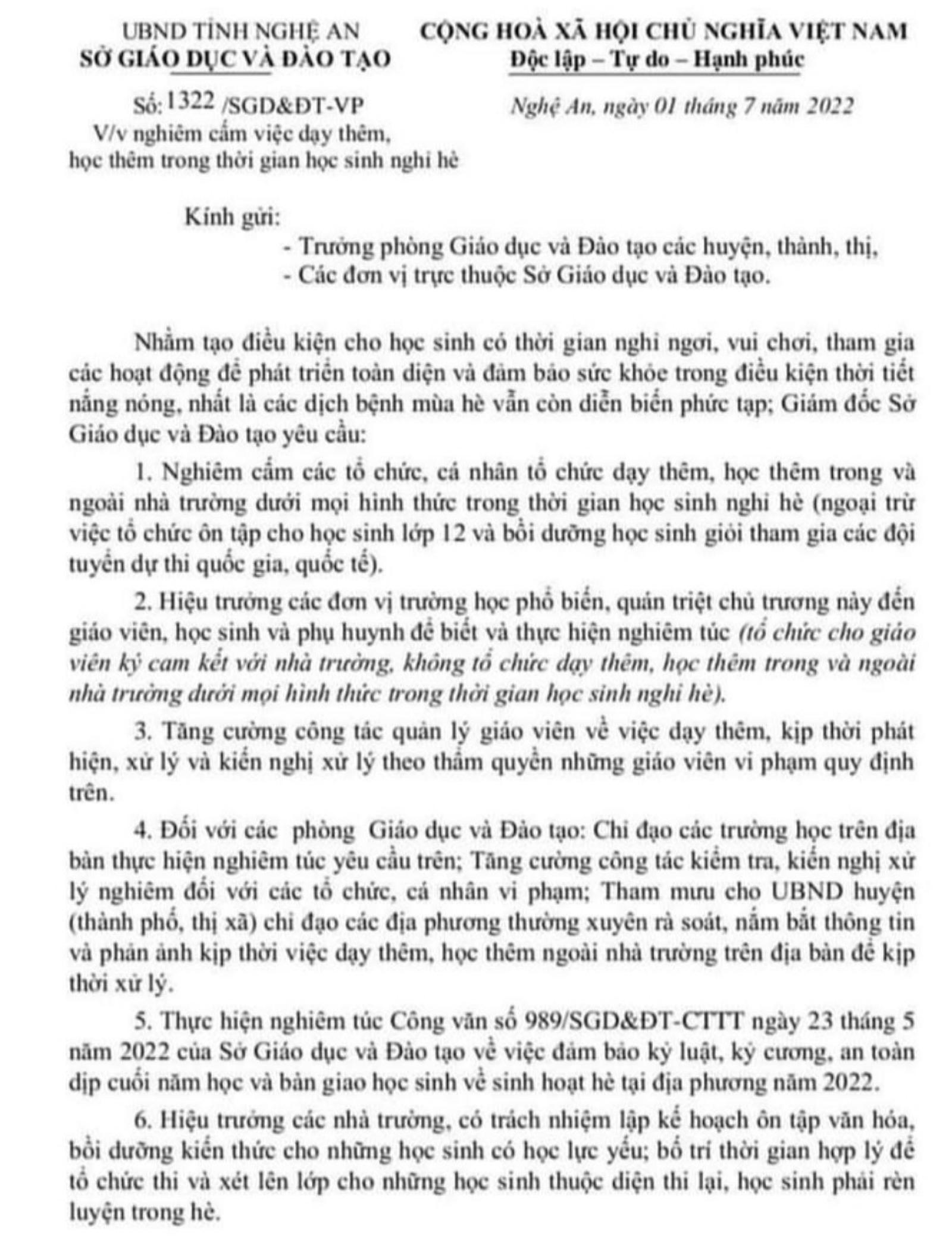 Công văn 1322 của Sở GD&ĐT Nghệ An về nghiêm cấm dạy thêm, học thêm dịp hè. Ảnh: Xuân Thống