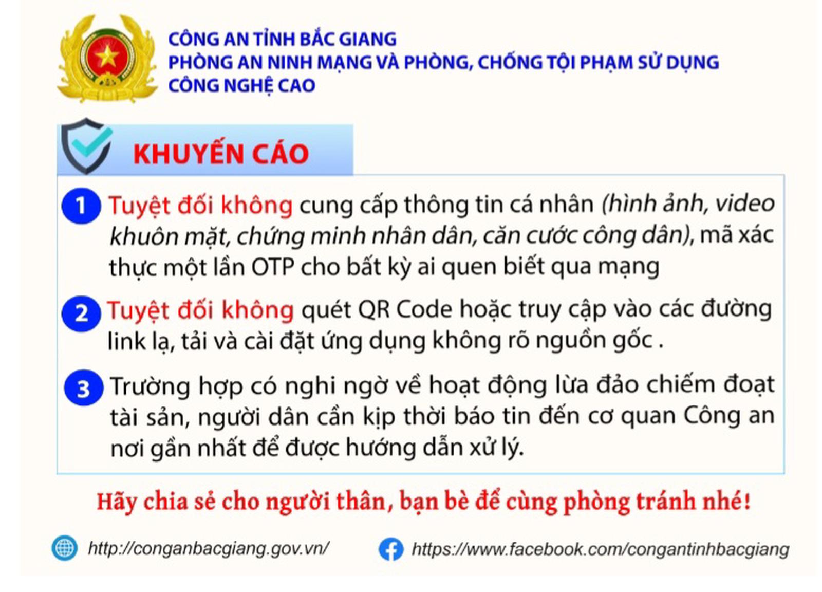 Công an tỉnh Bắc Giang khuyến cáo người dân tuyệt đối không cung cấp thông tin cá nhân, mã xác thực một lần OTP cho bất kỳ ai quen biết qua mạng; tuyệt đối không quét QR code hoặc truy cập vào các đường link lạ, tải cài đặt ứng dụng không rõ nguồn gốc.