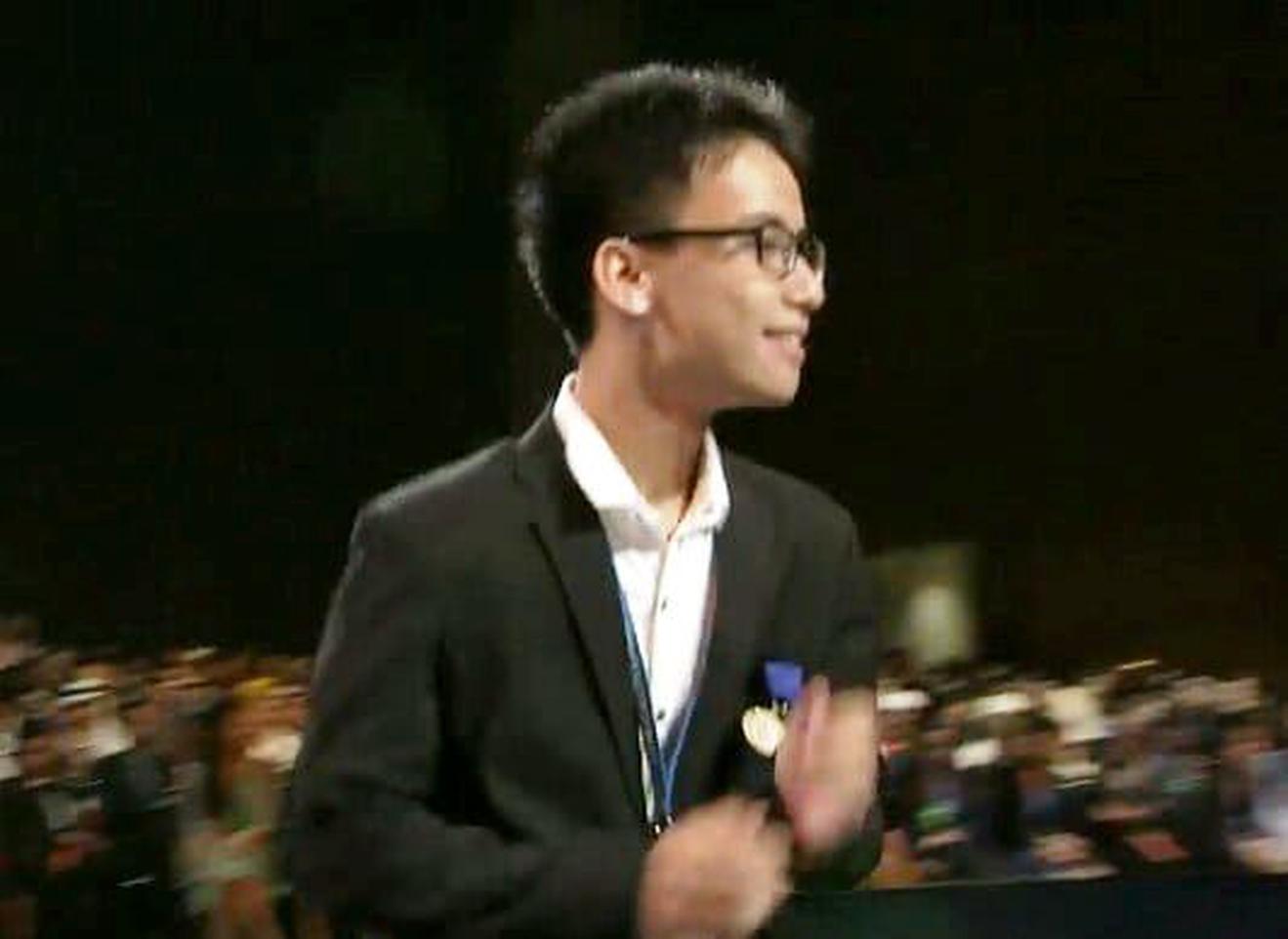 Em Phạm Huy (học lớp 11A3, Trường THPT thị xã Quảng Trị) đã đạt giải Ba cuộc thi Intel ISEF. Đây là giải thưởng cao nhất mà Đoàn Việt Nam nhận được trong lần tham dự này. Ảnh: LCL
