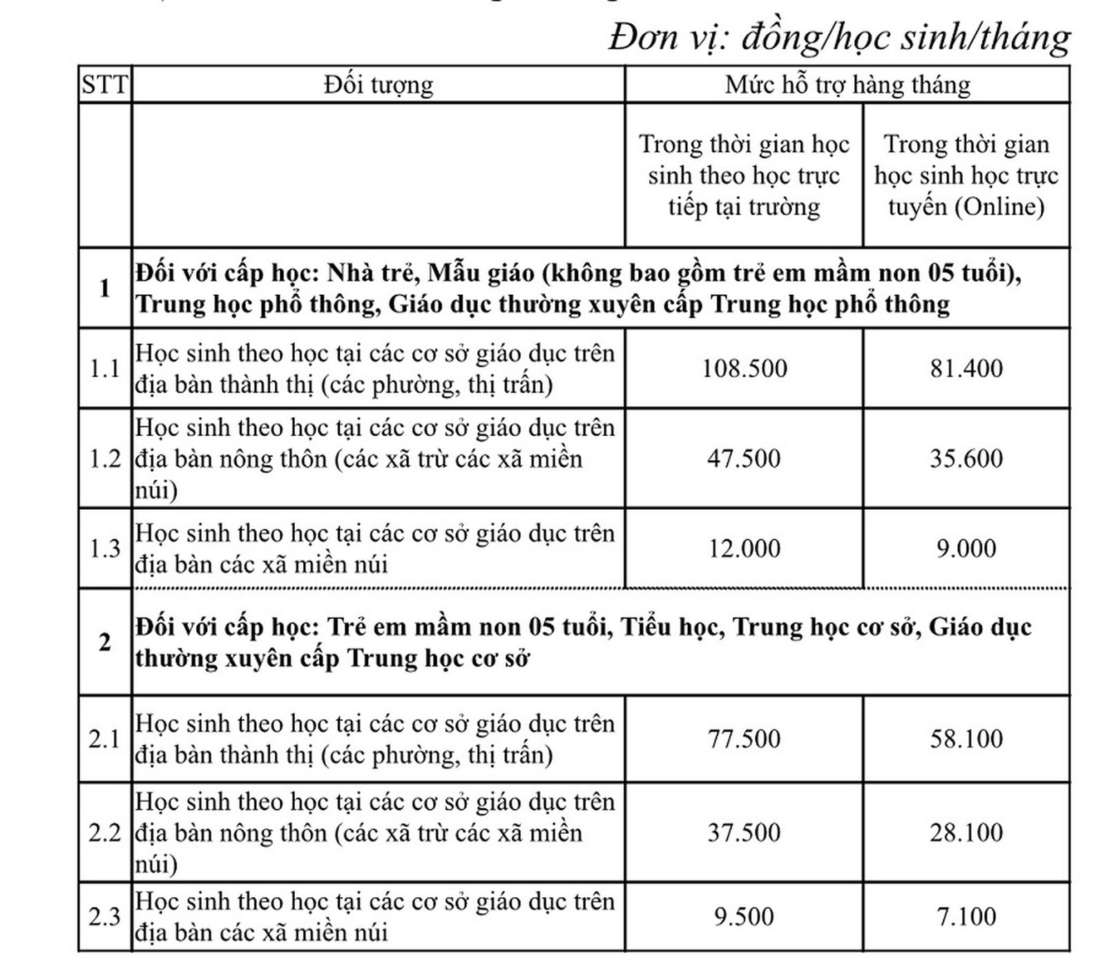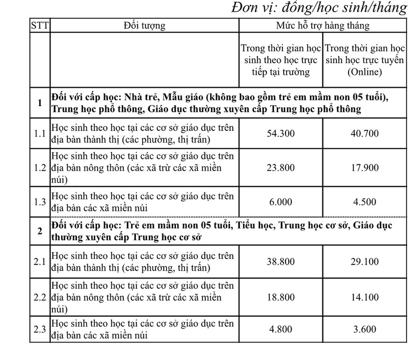 Thứ nhất: Trẻ em mầm non và học sinh phổ thông (không bao gồm đối tượng đã hưởng chế độ miễn, giảm học phí theo quy định) mức hỗ trợ hàng tháng là: