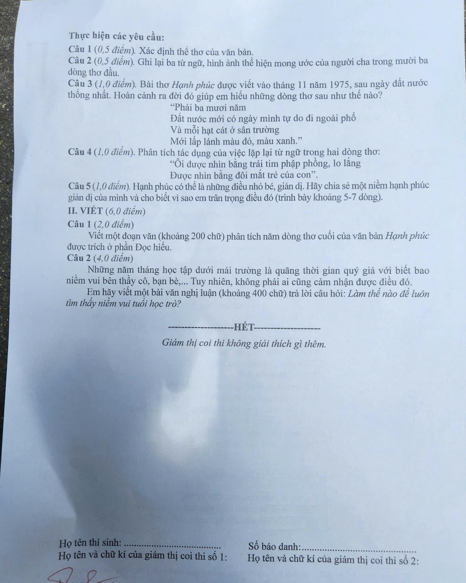 Đề thi có định dạng quen thuộc với 2 phần: Đọc hiểu và viết. Phần đọc hiểu, đề cho trích đoạn bài thơ "Hạnh Phúc" của tác giả Giang Nam - 1 tác phẩm viết năm 1974, sau ngày thống nhất đất nước và đưa ra 5 câu hỏi.