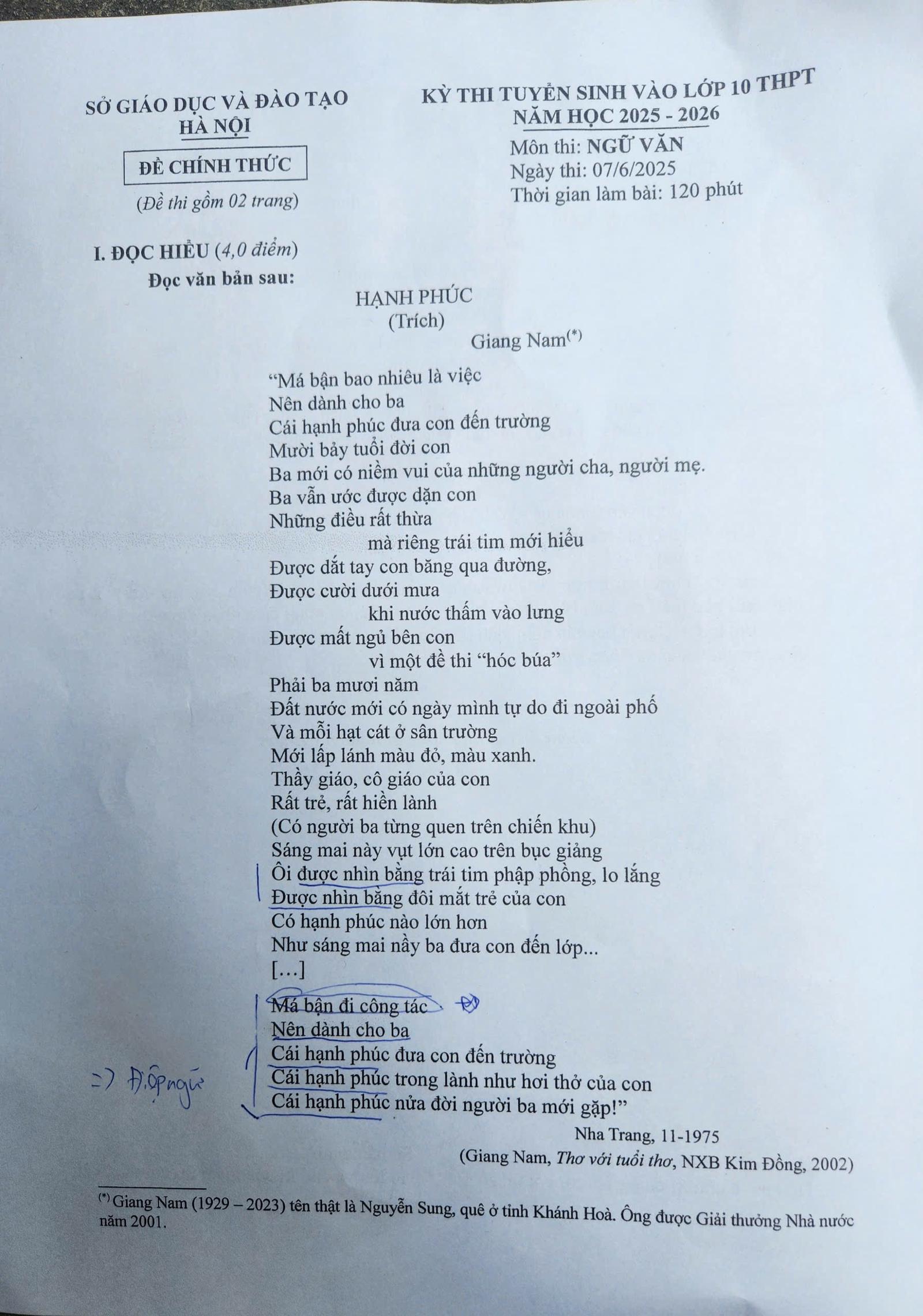 (Thanh tra) - Sáng 7/6, gần 103.000 thí sinh Hà Nội đã hoàn thành bài thi môn Ngữ văn - môn thi đầu tiên tại kỳ thi lớp 10 năm học 2025 - 2026. Đề thi được đánh giá là hay, gần gũi với học sinh khi đề cập tới chủ đề "hạnh phúc", với ngữ liệu từ bài thơ “Hạnh Phúc” của tác giả Giang Nam.