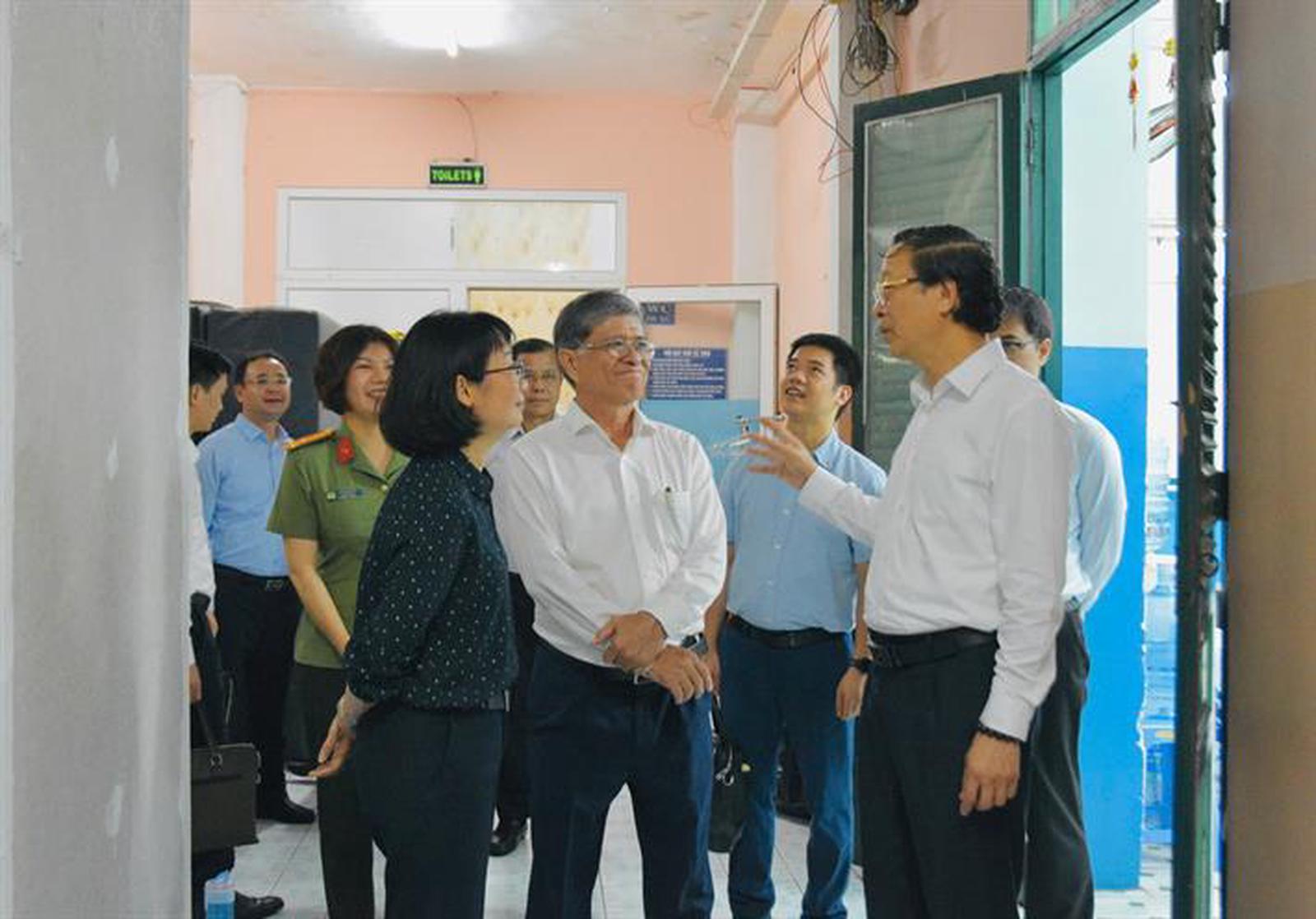 Thứ trưởng Bộ GD&ĐT Phạm Ngọc Thưởng lưu ý với TP Hồ Chí Minh tại các điểm kiểm tra. Ảnh: TTTT