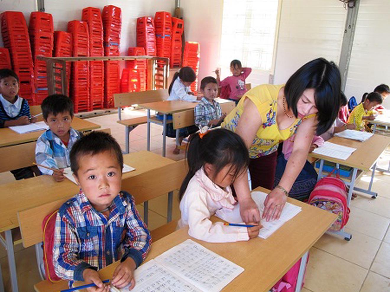 Nhưng, cái khó nhiều hơn là việc dạy chữ cho học sinh. Vì, cô không biết tiếng trò, trò không biết tiếng cô. Nhiều lúc cô giáo lớp 1 phải "mượn" học sinh lớp 4 lớp 5 làm phiên dịch. Để giáo viên hiểu học sinh, Ban Giám hiệu mở cuộc vận động học tiếng Mông cho toàn thể giáo viên. Cô giáo học tại lớp, học lúc nghỉ trưa. Lúc trò chuyện, cô giáo là học sinh. Ngày nghỉ, giờ nghỉ các cô vào bản "thực tập" giao tiếp với phụ huynh và đồng bào.