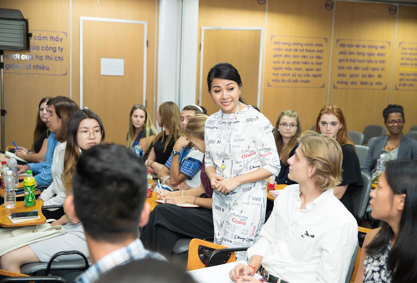 Bà Trần Uyên Phương, Phó tổng giám đốc Tập đoàn Tân Hiệp Phát, tác giả quyển sách tiếng Anh Competing with Giants giao lưu với đoàn sinh viên quốc tế Semester At Sea