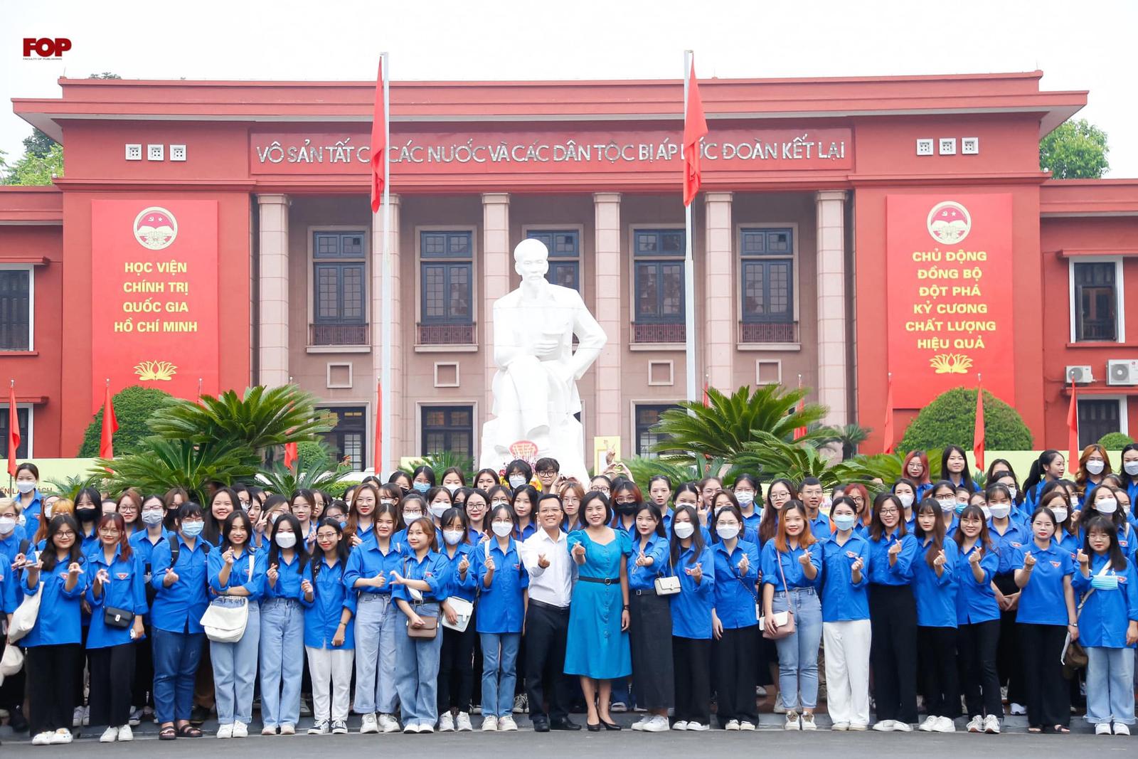 TS Vũ Thùy Dương, Trưởng Khoa cùng các sinh viên Khoa Xuất bản, Học viện Báo chí và Tuyên truyền, chụp ảnh lưu niệm nhân dịp tham dự hội thảo. Ảnh: FOP