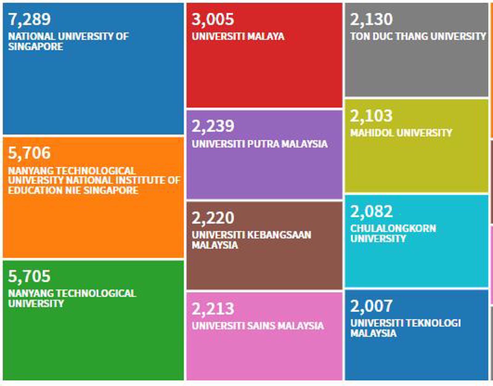 Đứng đầu tốp 10 này vẫn là 2 đại học của Singapore; với Đại học quốc gia Singapore là số 1. tiếp theo Đại học kỹ thuật Nanyang. Lưu ý rằng có hai tên đơn vị trong WoS liên quan đến đại học này nhưng thật ra chỉ là một đại học. Điều đáng quan tâm là 4 đại diện tiếp theo là các đại học rất mạnh của Malaysia theo thứ tự gồm Đại học Malaya, Đại học Putra Malaysia, Đại học Kebangsaan Malaysia, Đại học Sains Malaysia. Đại diện duy nhất của Việt Nam đứng thứ 7. Kế tiếp là 2 đại học hàng đầu của Thái Lan (Đại học Mahidol và Chulalongkorn). Vị trí thứ 10 là một đại học của Malaysia, Đại học kỹ thuật Malaysia.