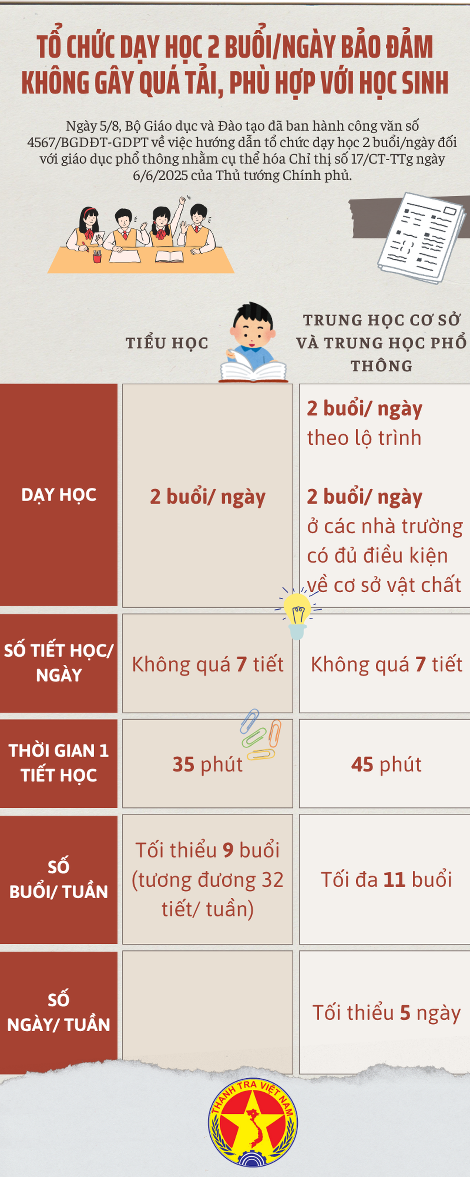 Theo định hướng của Bộ Giáo dục và Đào tạo, việc tổ chức dạy học 2 buổi/ngày cần được triển khai theo hướng không cứng nhắc, linh hoạt theo điều kiện từng địa phương, từng trường, từng cấp học. Đặc biệt, phải gắn với nguyên tắc tự nguyện, không gây quá tải, phát huy năng lực cá nhân, lấy học sinh làm trung tâm.