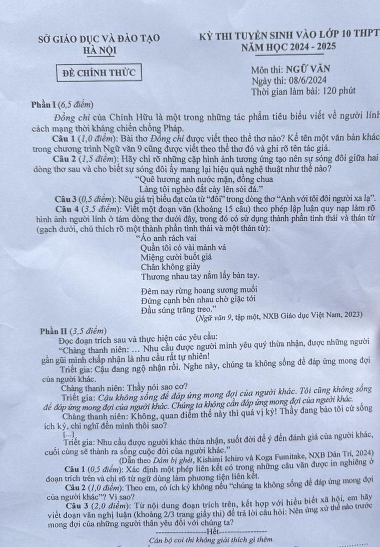 Vào tối 8/6, sau khi thí sinh Hà Nội hoàn thành môn Ngữ văn và môn Ngoại ngữ của kỳ thi tuyển sinh lớp 10 năm học 2024 - 2025, mạng xã hội râm ran thông tin lộ đề thi môn Ngữ văn.