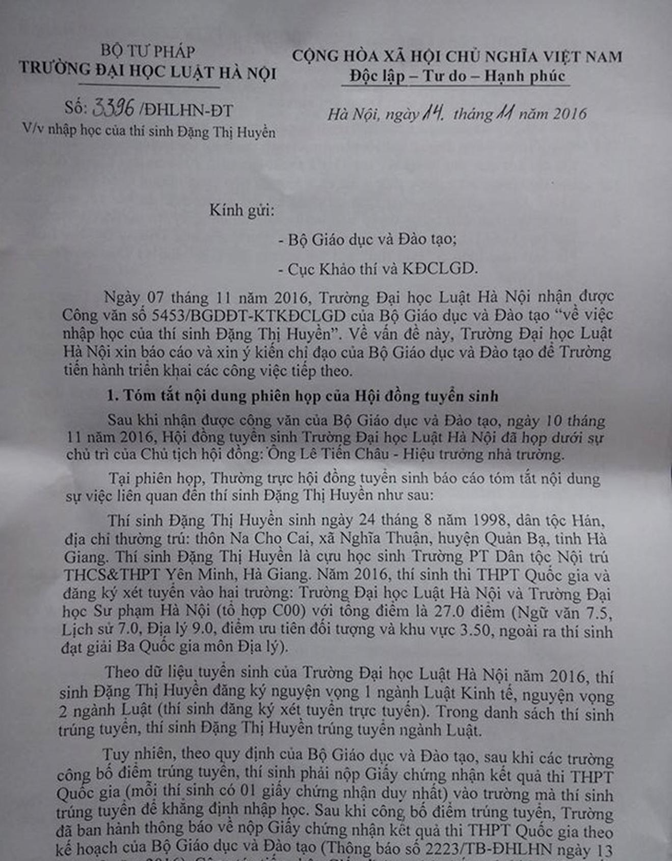 Tuy nhiên, Công văn số 5453/BGDĐT-KTKĐCLGD của Bộ Giáo dục và Đào tạo có nội dung: “Bộ Giáo dục và Đào tạo chuyển tới Trường Đơn đề nghị của thí sinh, công văn của Sở Giáo dục và Đào tạo Hà Giang. Đề nghị Trường Đại học Luật Hà Nội căn cứ vào hoàn cảnh thực tế của gia đình và thí sinh và ý kiến của Sở Giáo dục và Đào tạo Hà Giang để xem xét, tiếp nhận thí sinh Đặng Thu Huyền vào học ngành thí sinh đã trúng tuyển”.