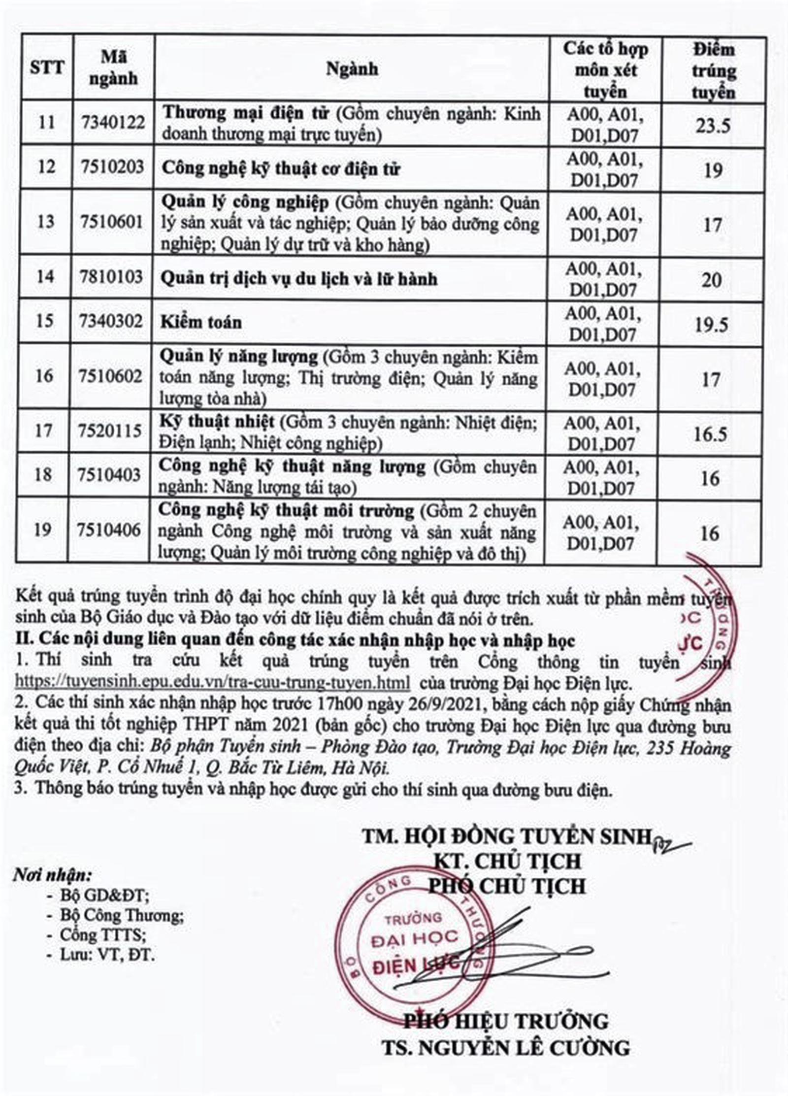 Các thí sinh trúng tuyển xác nhận nhập học trước 17 giờ ngày 26/9/2021, bằng cách nộp Giấy chứng nhận kết quả thi tốt nghiệp THPT năm 2021 (bản gốc) cho Trường Đại học Điện lực qua đường bưu điện theo địa chỉ: Bộ phận tuyển sinh – Phòng Đào tạo, Trường Đại học Điện lực, 235 Hoàng Quốc Việt, phường Cổ Nhuế 1, quận Bắc Từ Liêm, TP Hà Nội.
