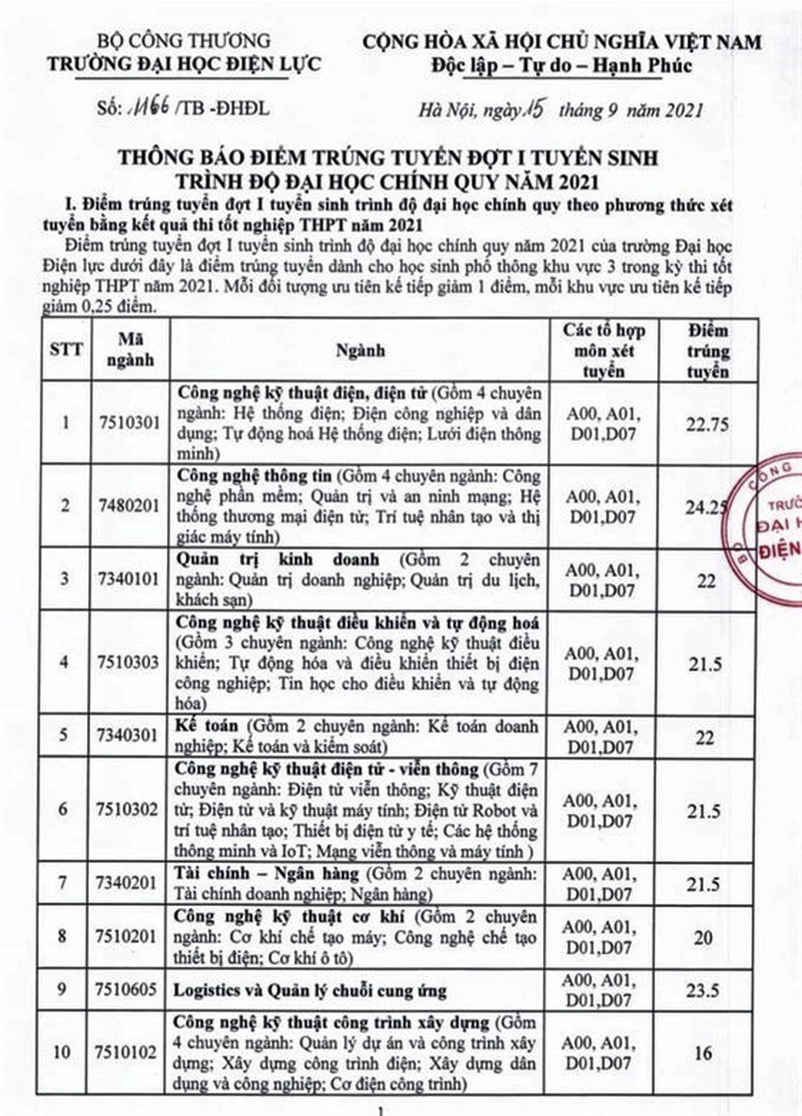 (Thanh tra) – Thông tin về điểm trúng tuyển đợt 1 tuyển sinh trình độ đại học chính quy theo phương thức xét tuyển kết quả thi tốt nghiệp THPT năm 2021, Hội đồng tuyển sinh Trường Đại học Điện lực cho biết, ngành Công nghệ thông tin (gồm 4 chuyên ngành: Công nghệ phần mềm; Quản trị và an ninh mạng; Hệ thống thương mại điện tử; Trí tuệ nhân tạo và thị giác máy tính) có điểm chuẩn cao nhất là 24,25 điểm.