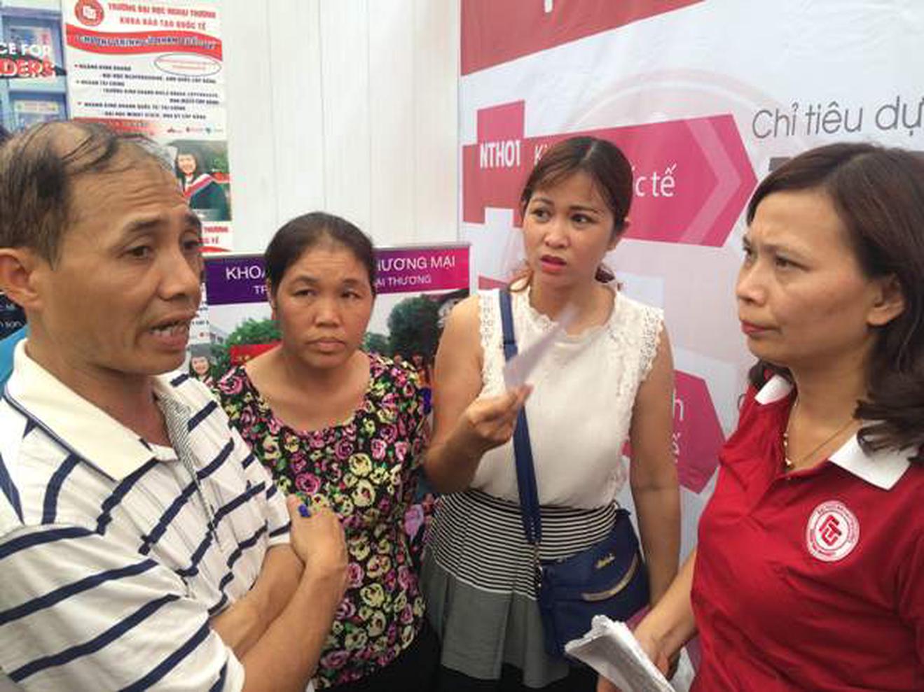 Thí sinh cần phải cân nhắc kỹ khi quyết định chọn trường nộp hồ sơ. Trong ảnh: Thí sinh và người nhà nghe giảng viên ĐH Ngoại thương tư vấn chọn trường. Ảnh: HH