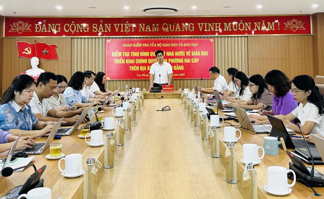 (Thanh tra) - Ngày 14/8, Đoàn công tác của Bộ Giáo dục và Đào tạo (GD&ĐT) do ông Nguyễn Xuân Thủy - Phó Cục trưởng Cục Giáo dục nghề nghiệp, Giáo dục thường xuyên làm Trưởng đoàn kiểm tra tình hình quản lý Nhà nước về giáo dục khi triển khai chính quyền địa phương 2 cấp tại Cao Bằng.