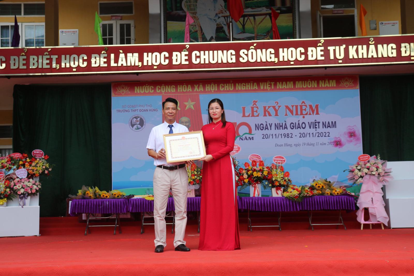 Bà Trần Thị Thu Hằng - Ủy viên Ban Thường vụ, Trưởng ban Tuyên giáo Huyện ủy thừa ủy quyền của UBND tỉnh tặng Bằng khen cho tập thể nhà trường