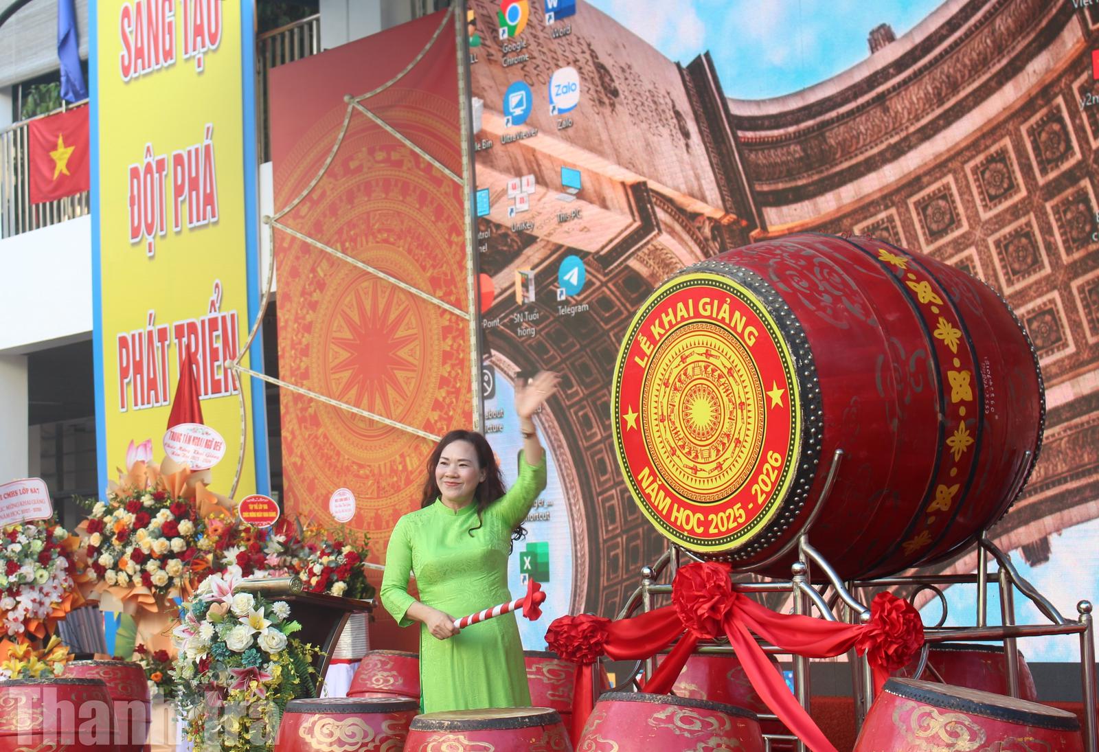 Cô Lê Minh Nguyệt, Hiệu trưởng nhà trường đánh trống khai giảng năm học mới 2025-2026. Ảnh: HH
