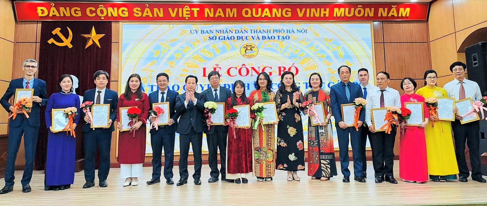 Lãnh đạo Sở GD&ĐT Hà Nội trao quyết định cho các cán bộ quản lý các trường công lập. Ảnh: Sở GD&ĐT