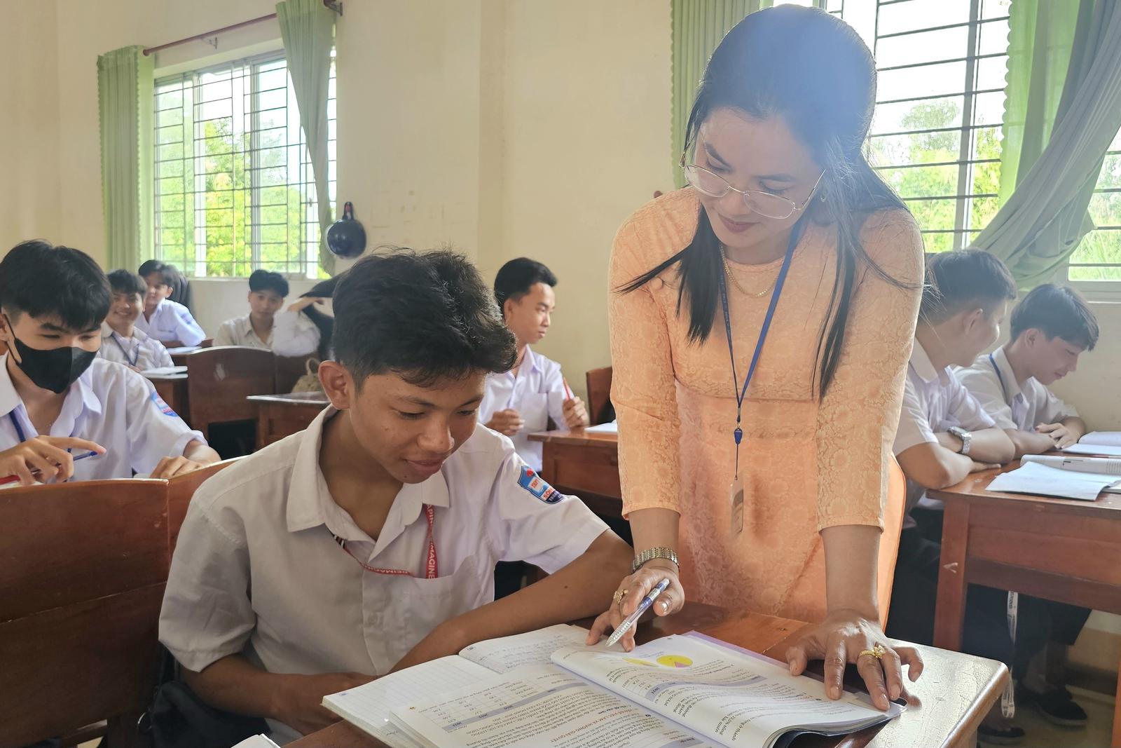 Cô Trần Tố Nhi chỉ bài cho các em học sinh trong giờ lên lớp. Ảnh: Hoàng Tuấn
