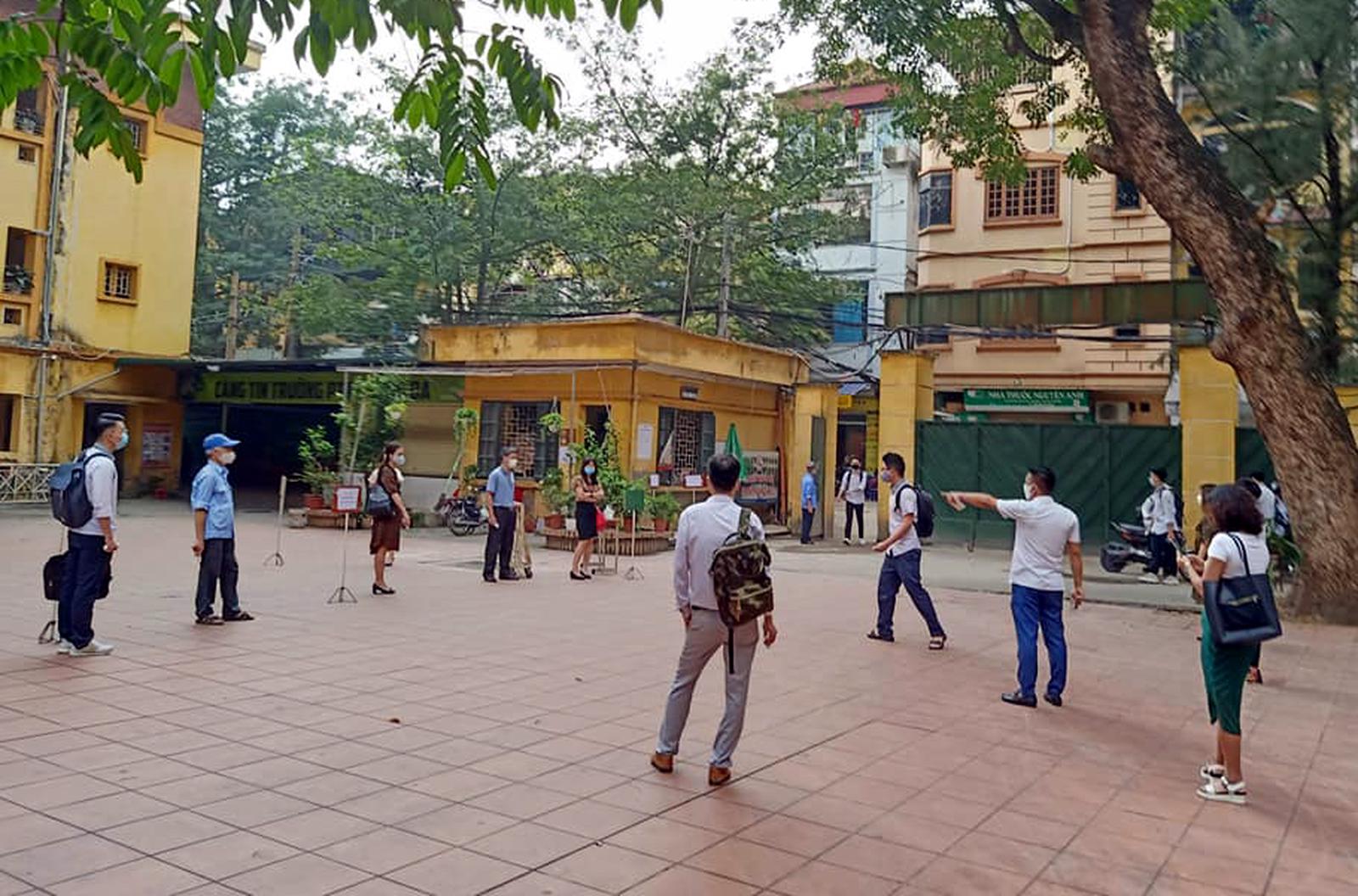 Trường THPT Đống Đa thực hiện chia luồng di chuyển bảo đảm giữ khoảng cách theo đúng quy định phòng, chống dịch Covid-19. Ảnh: LP