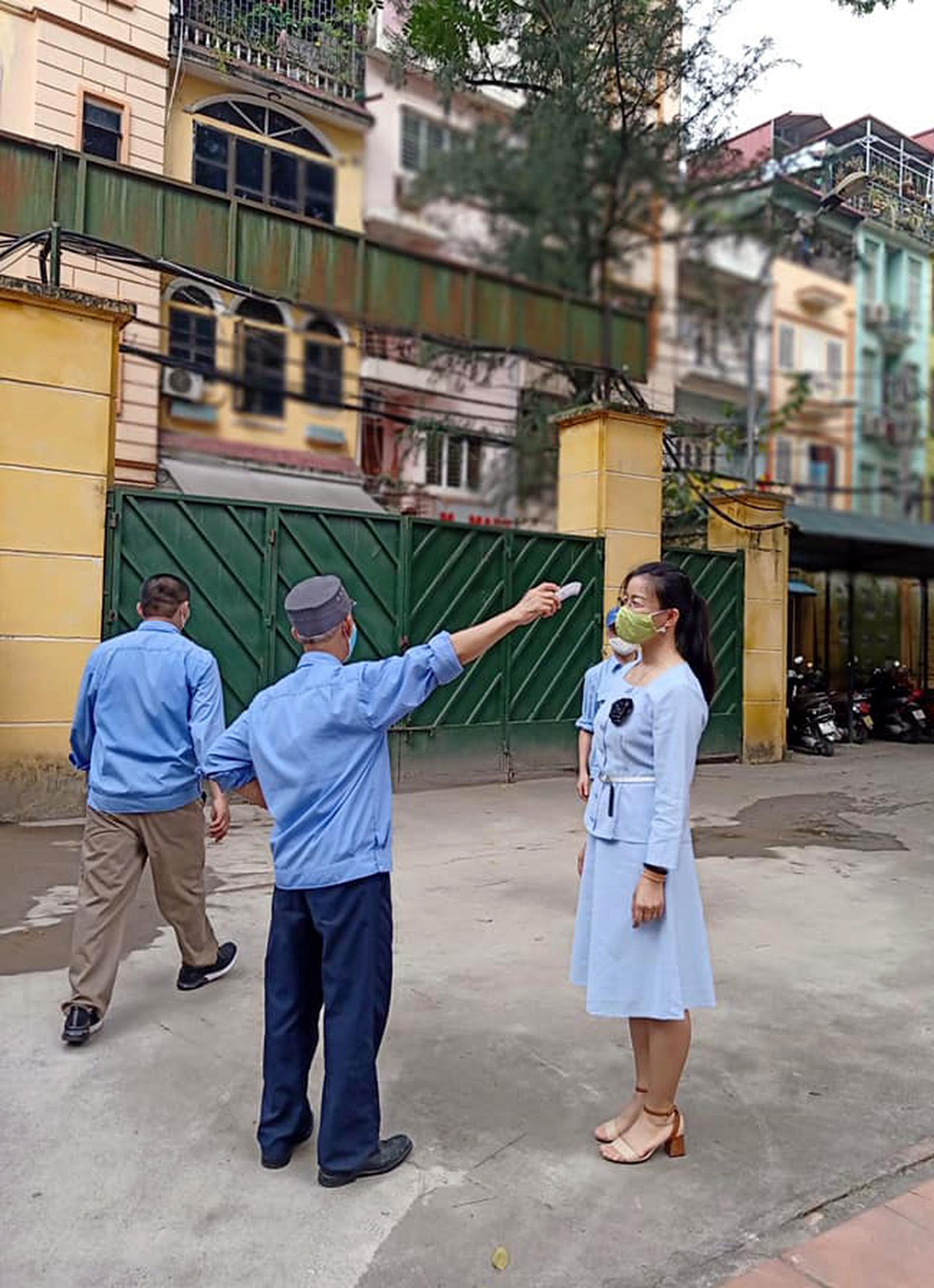 Giáo viên cũng được đo kiểm tra thân nhiệt trước khi vào trường theo đúng quy định. Ảnh: LP