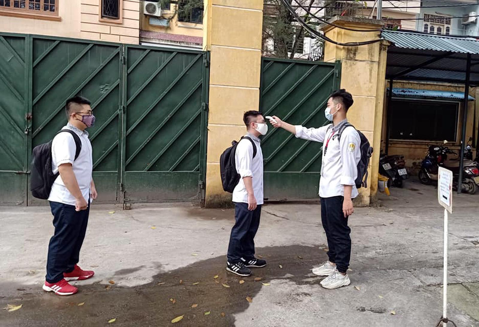 Trường THPT Đống Đa (Hà Nội) bố trí cán bộ đo thân nhiệt và hướng dẫn học sinh sát trùng tay trước khi vào trường, lớp học, bảo đảm công tác phòng, chống dịch Covid-19. Ảnh: LP