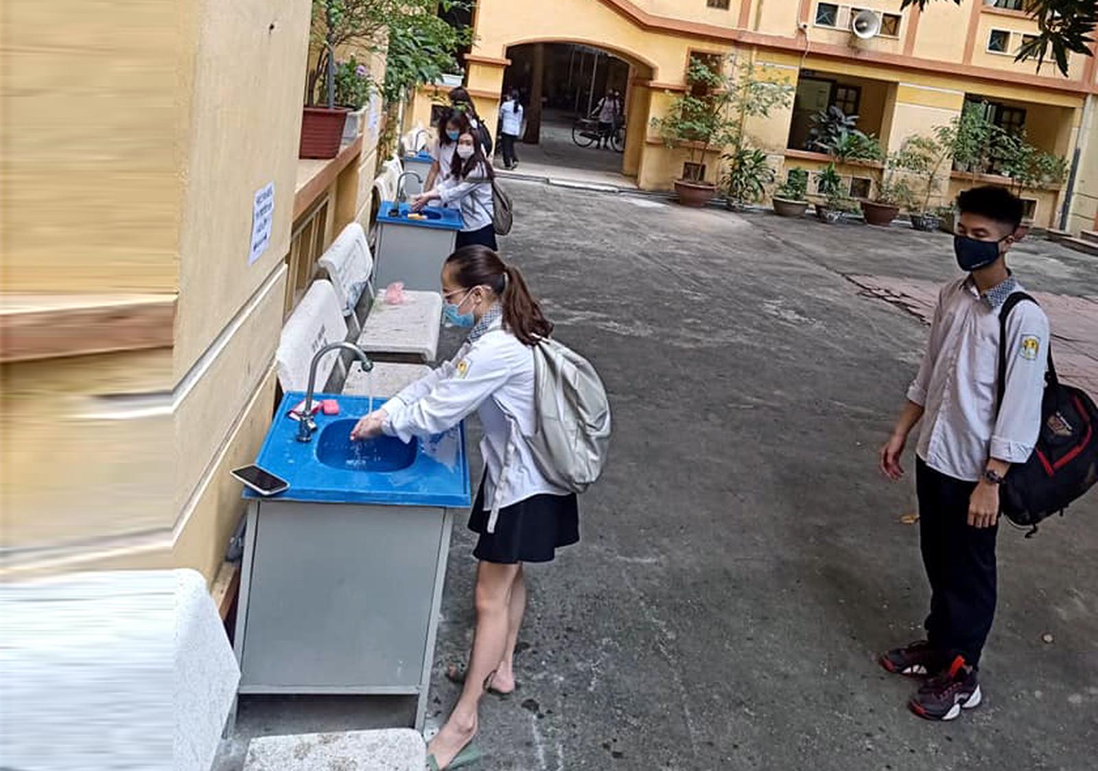 Trường THPT Đống Đa bố trí khu vực rửa tay riêng cho học sinh. Ảnh: LP