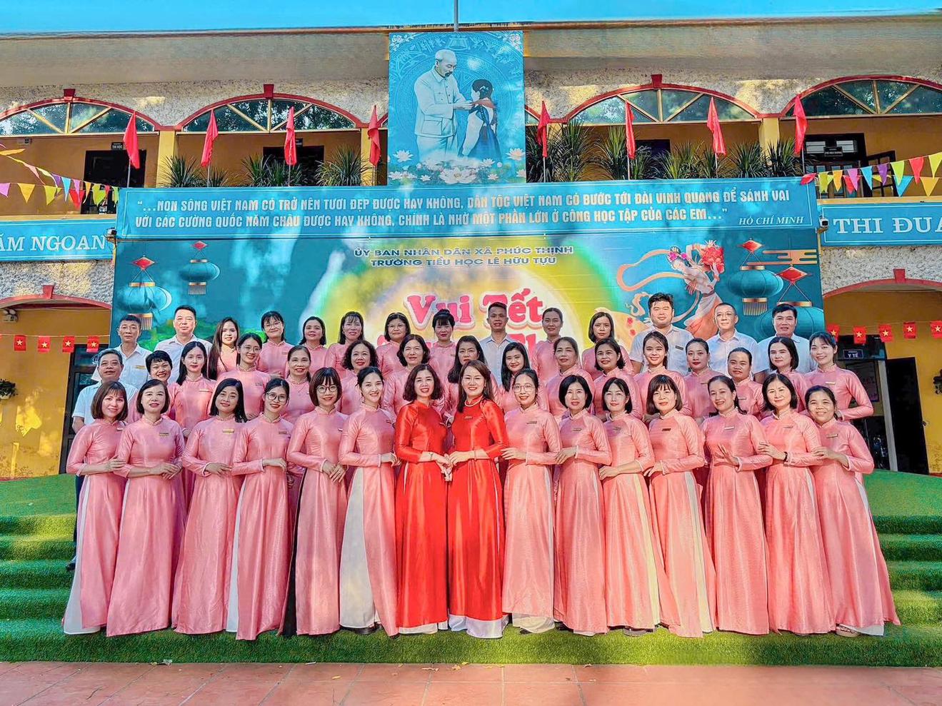 Bà Nguyễn Thị Thanh Tâm, Hiệu trưởng Trường Tiểu học Lê Hữu Tựu (áo dài đỏ, bên phải), cùng toàn thể giáo viên nhà trường. Ảnh: NVCC