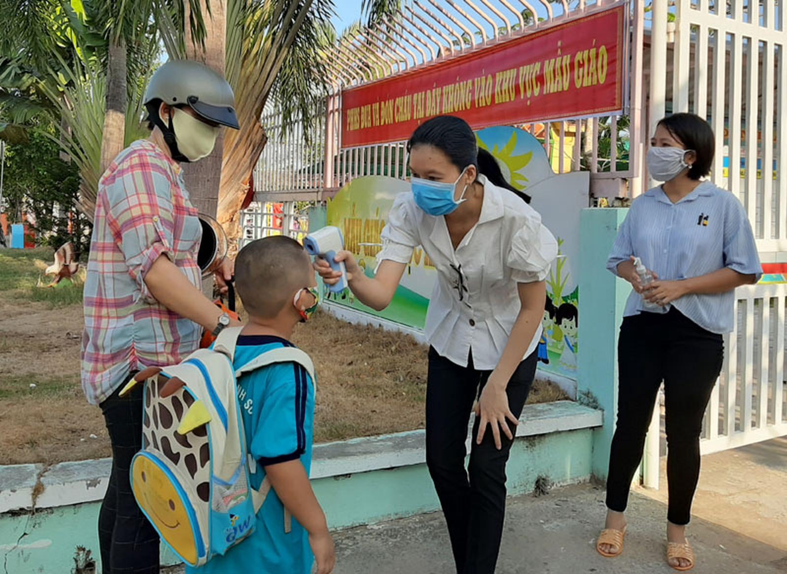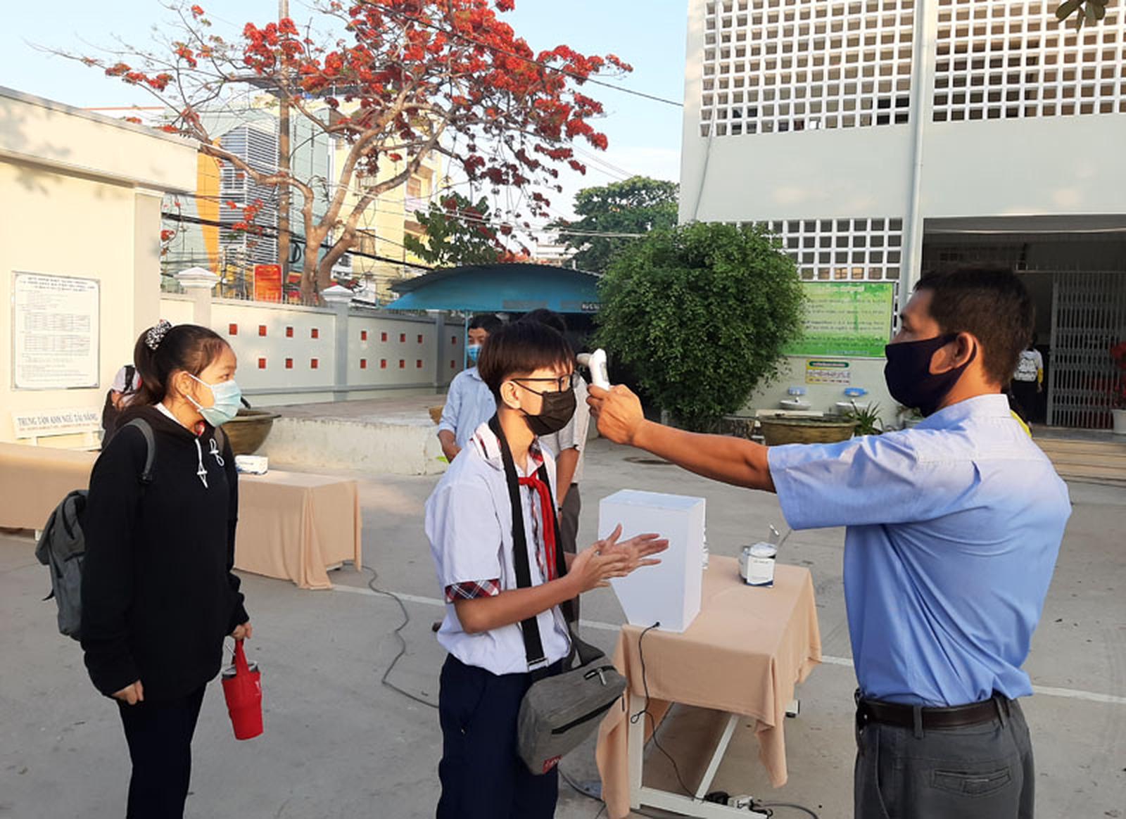 Tại Trường THPT Hoàng Diệu (TP Sóc Trăng), công tác đảm bảo an toàn cho giáo viên, học sinh được thực hiện nghiêm túc. Giáo viên và học sinh khi đến trường đều được đo thân nhiệt ngay tại cổng trường.