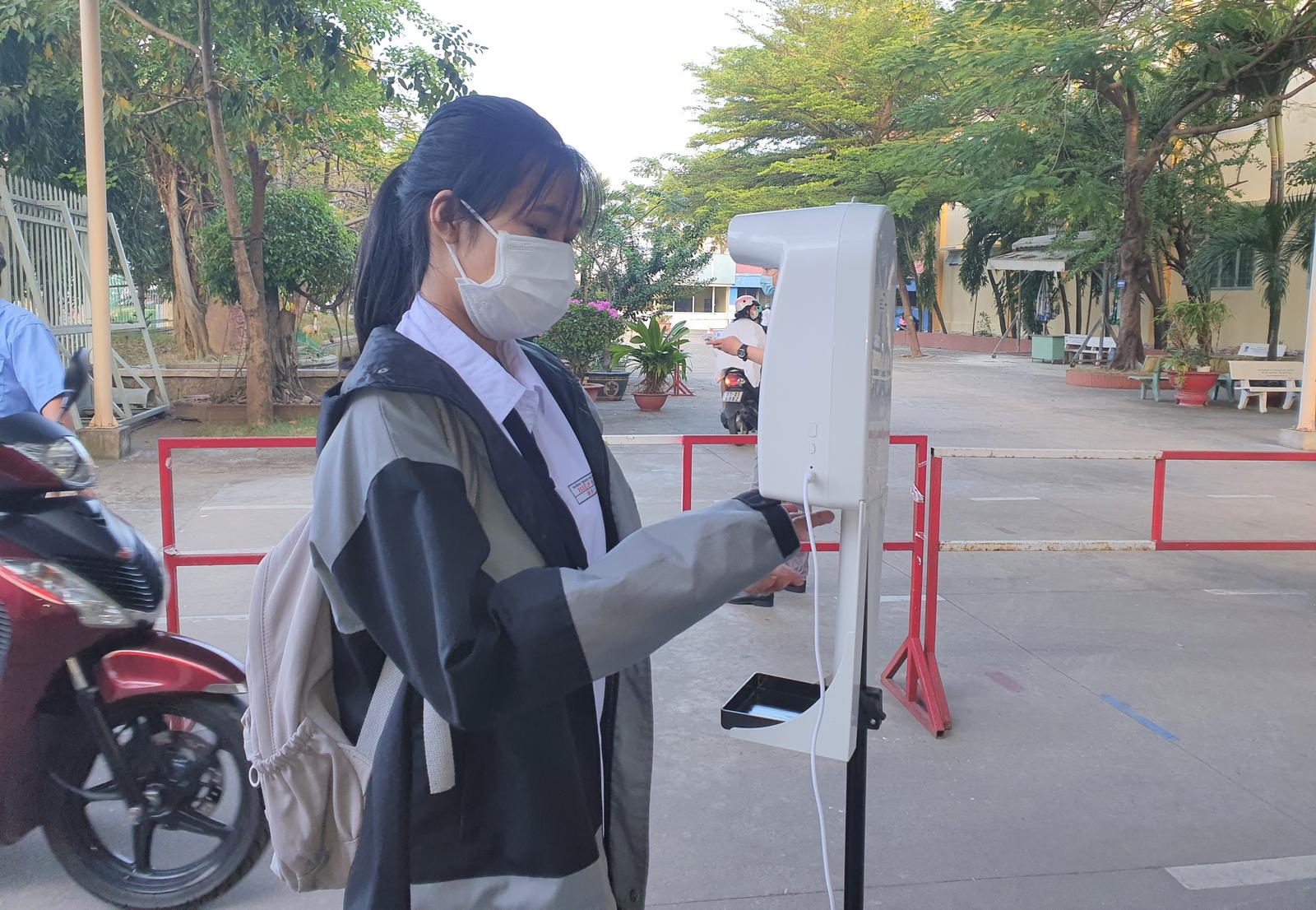Học sinh kiểm tra thân nhiệt, sát khuẩn trước khi vào lớp học. Ảnh: Đinh Mười