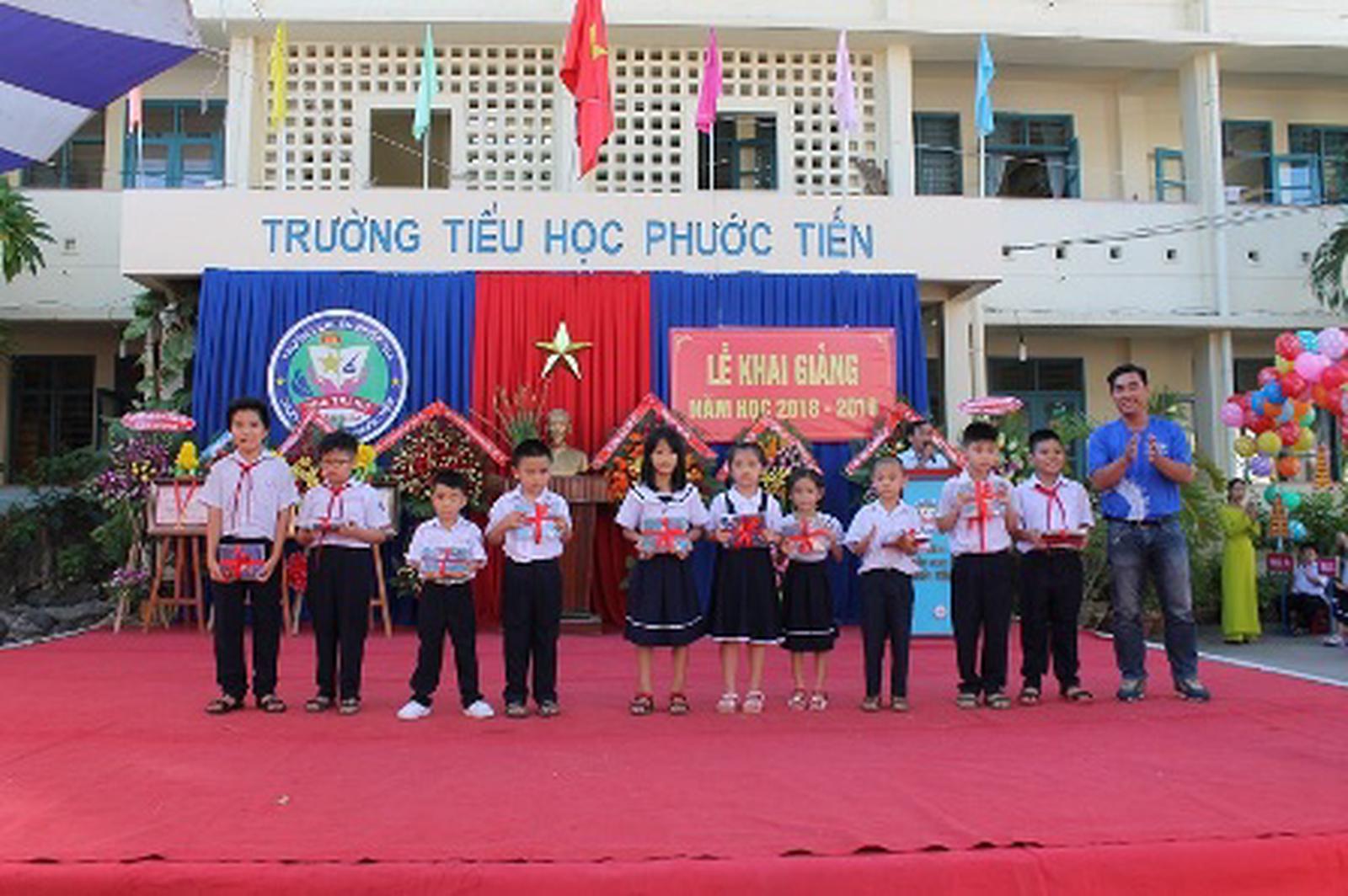 Tặng phần thưởng cho học sinh nhân dịp năm học mới. Ảnh: Xuân Hướng