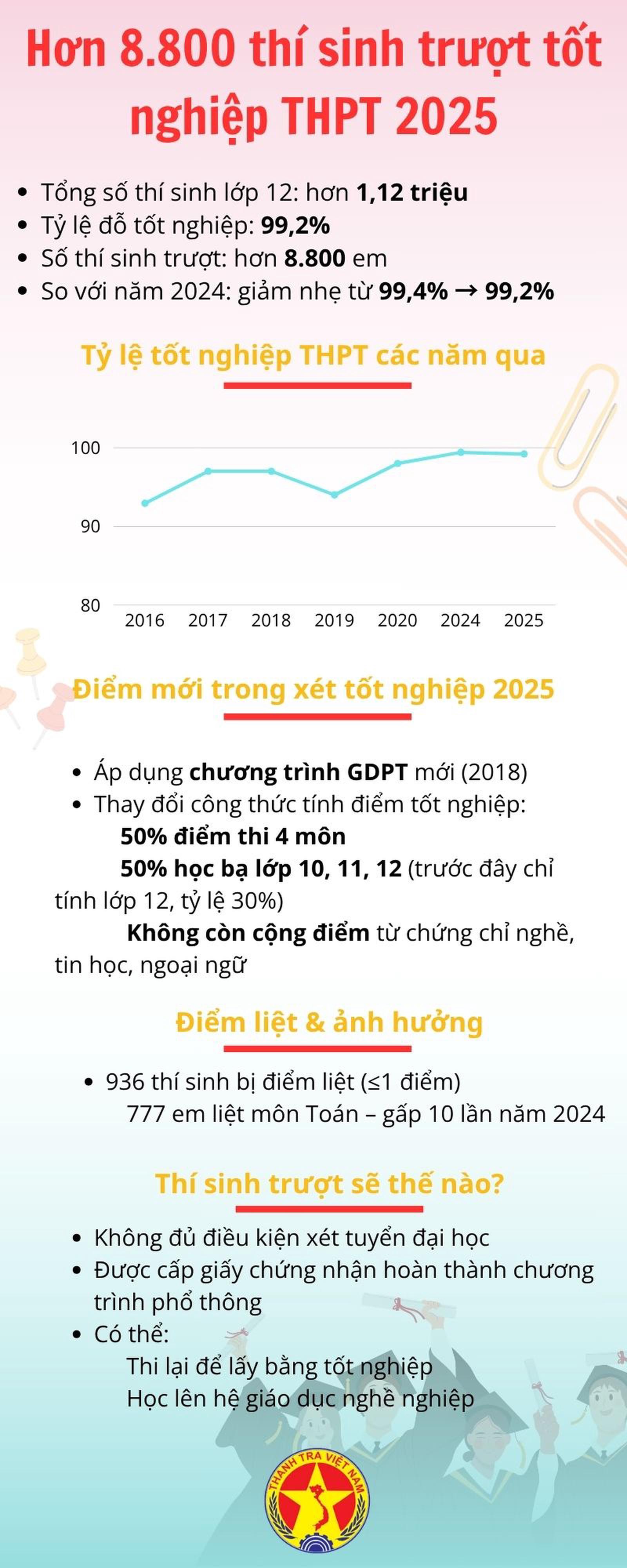 Bên cạnh đó, việc hơn 8.800 học sinh trượt tốt nghiệp, dù chiếm tỷ lệ nhỏ nhưng cũng là dấu hiệu cần được phân tích kỹ, nhất là trong bối cảnh năm 2025 là năm đầu tiên áp dụng cách tính điểm xét tốt nghiệp theo phương án mới.