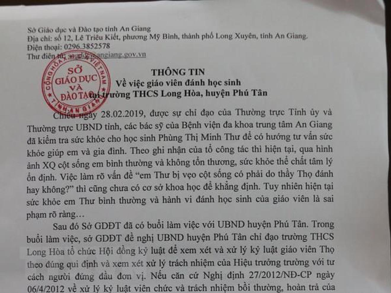 Theo ông Nhàn, việc một số cơ quan báo chí và mạng xã hội đăng tải thông tin thầy giáo Lê Trường Thọ (giáo viên chủ nhiệm lớp 7A3 - Trường Trung học cơ sở Long Hòa (ấp Long Hòa 1, xã Long Hòa, huyện Phú Tân) dùng thước đánh phạt em Phùng Thị Minh Thư, học sinh lớp 7A3 - Trường Trung học cơ sở Long Hòa (ấp Long Hòa 1, xã Long Hòa, huyện Phú Tân) dẫn đến việc em Thư bị vẹo cột sống là hư cấu và không đúng sự thật.