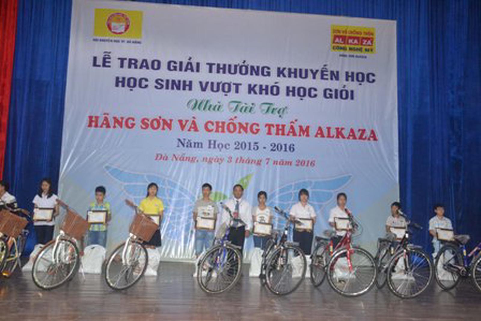 Ông Trần Thanh Đô, Tổng Giám đốc Hãng sơn và chống thấm Alkaza cùng lãnh đạo Hội Khuyến học Đà Nẵng trao 20 phần thưởng cho các em học sinh đạt giải cấp quận, huyện trở lên. Ảnh: Ngọc Phó