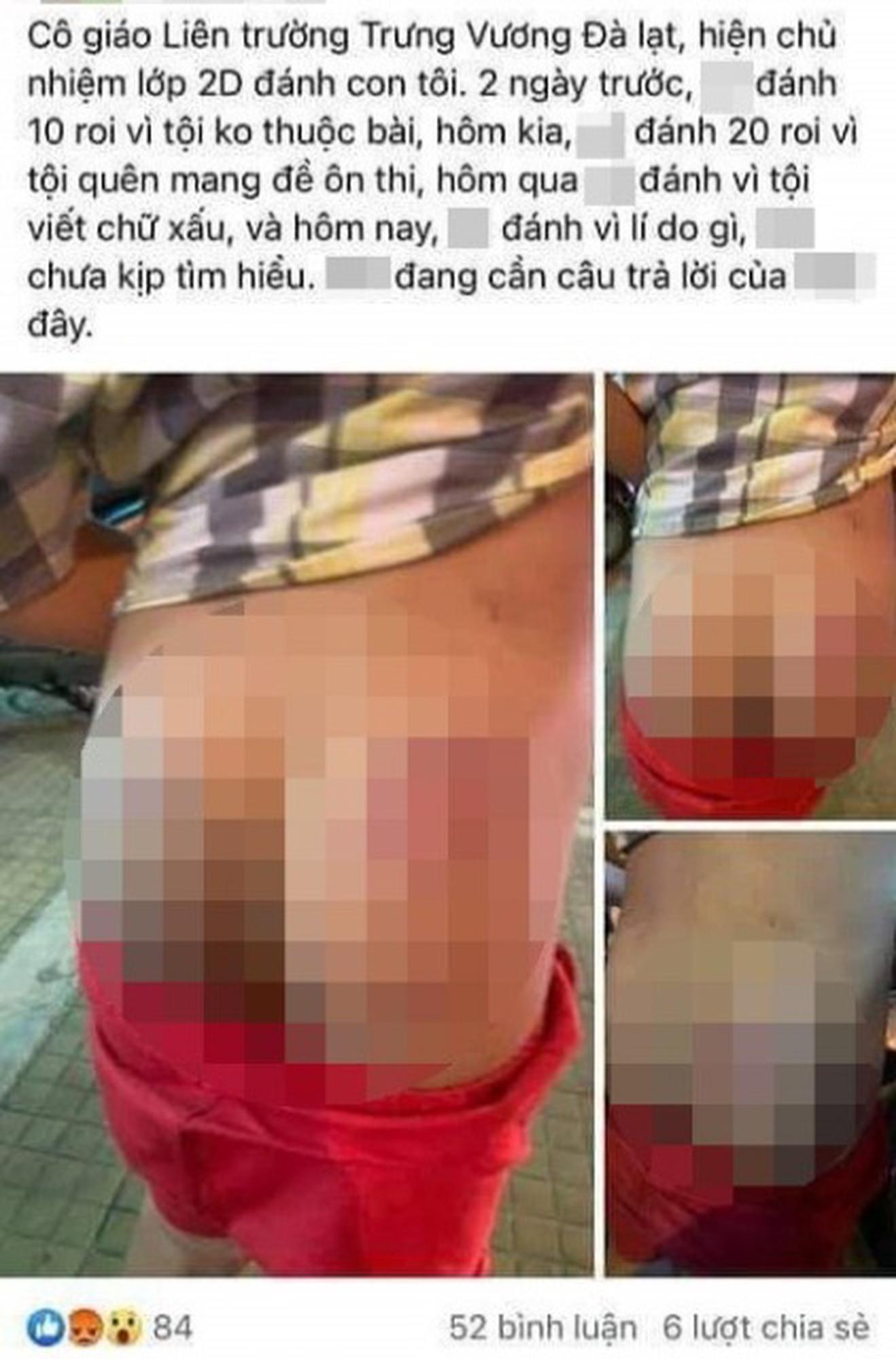 Trước đó, Báo Thanh tra đã phản ánh, trên mạng xã hội Facebook xuất hiện hình ảnh một học sinh lớp 2 bị đánh bầm tím phần mông, kèm theo thông tin tố cáo cô giáo Liên - Chủ nhiệm lớp 2D, Trường Tiểu học Trưng Vương, TP Đà Lạt nhiều lần đánh cháu P.H.K (học sinh lớp 2D), lãnh đạo Trường Tiểu học Trưng Vương thừa nhận vụ việc trên xảy ra ở trường.
