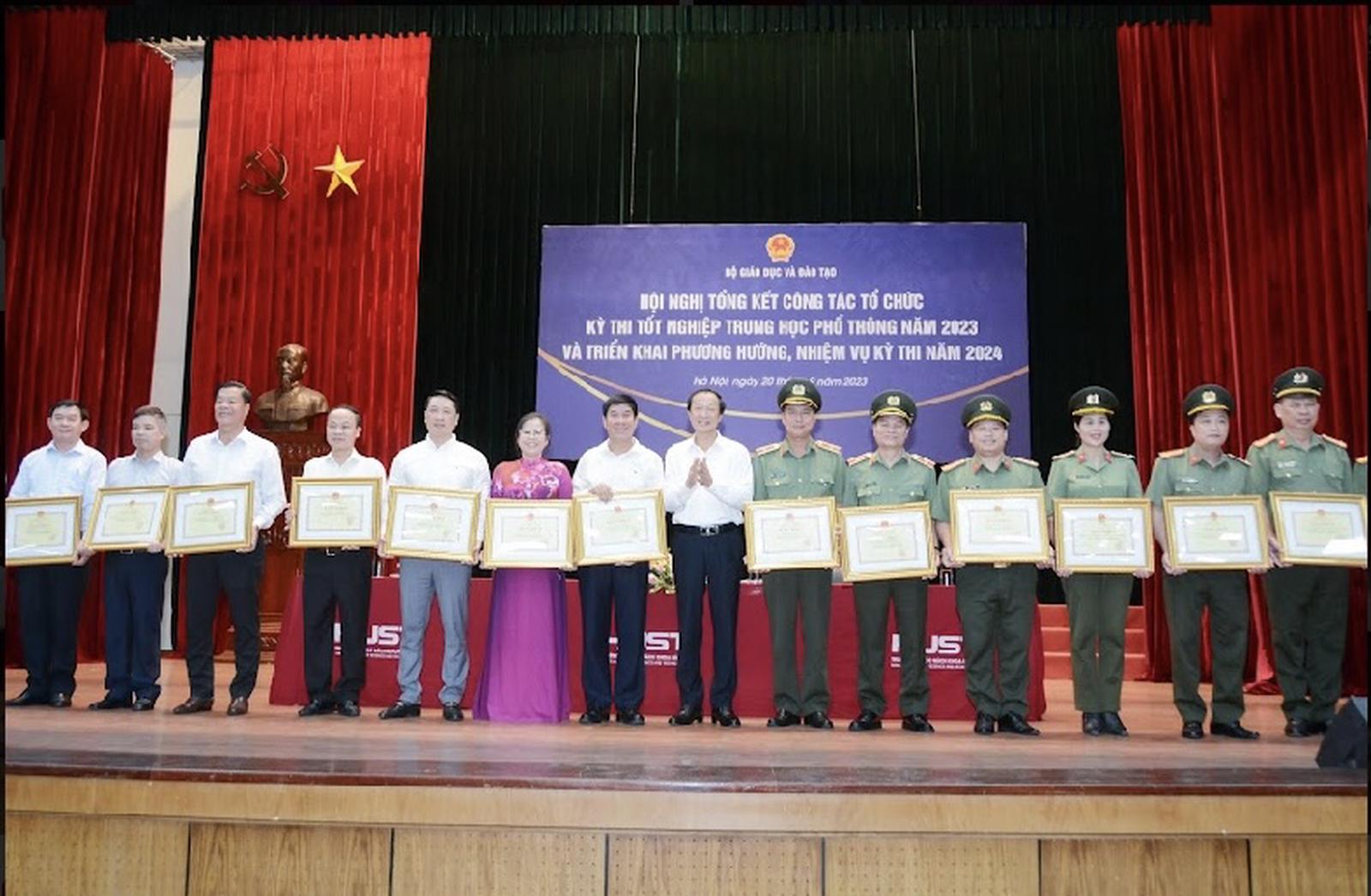 Thứ trưởng Bộ GDĐT Phạm Ngọc Thưởng trao bằng khen của Bộ trưởng Bộ GDĐT cho các tập thể, cá nhân có thành tích trong Kỳ thi tốt nghiệp THPT 2023. Ảnh: LP