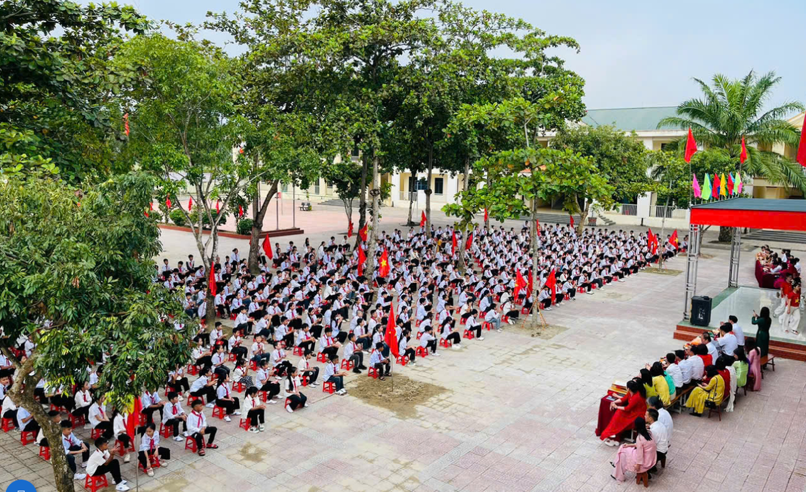 Thầy cô giáo và học sinh Trường THCS Trung Phú, Hà Tĩnh trong một buổi sinh hoạt dưới cờ. Ảnh: NVCC