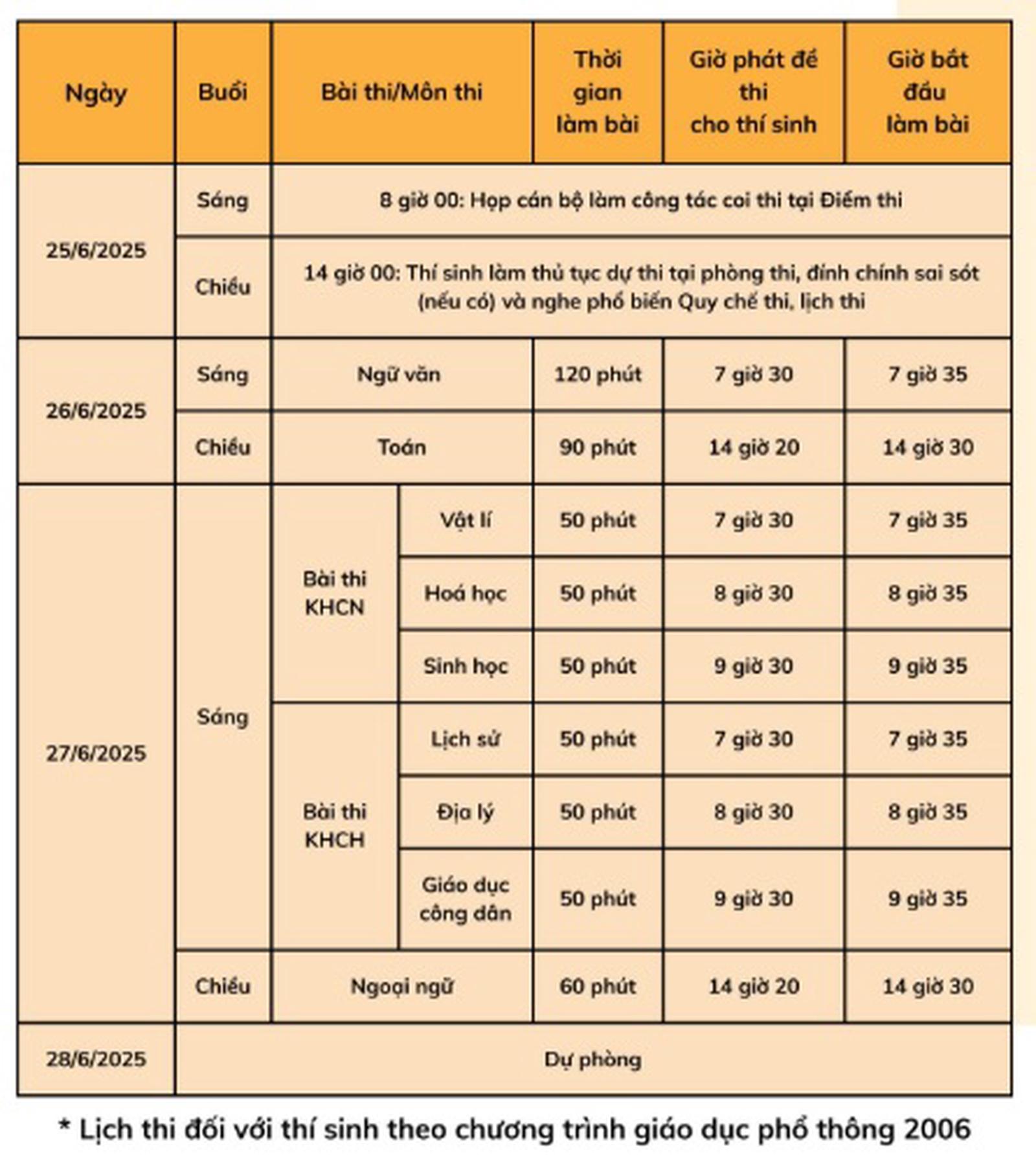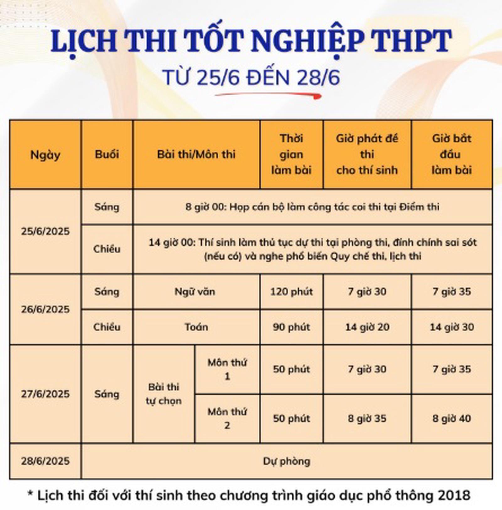 Kỳ thi tốt nghiệp THPT năm 2025 diễn ra trong 3 ngày (25 đến 27/6), ngày 25/6 thí sinh làm thủ tục dự thi, các ngày 26 và 27/6 là ngày thi chính thức, và ngày 28/6 là ngày dự phòng.