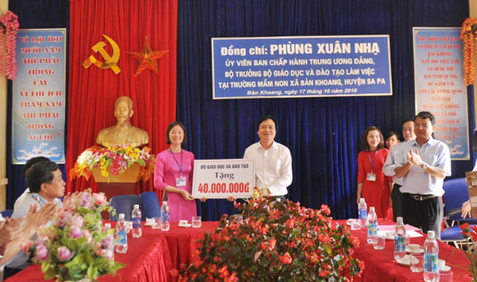 Bộ trưởng Bộ Giáo dục Đào tạo tặng quà Trường Mầm non Bản Khoang (Sa Pa). Ảnh: LC