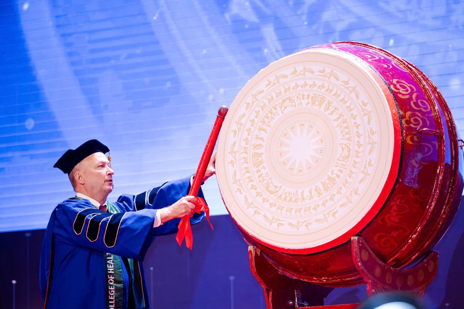Khoảnh khắc xúc động và tràn đầy hứng khởi khi Giáo sư David Bangsberg, Hiệu trưởng Trường Đại học VinUni, đánh hồi trống khai giảng chào mừng năm học mới và chào đón các tân sinh viên khóa 5.