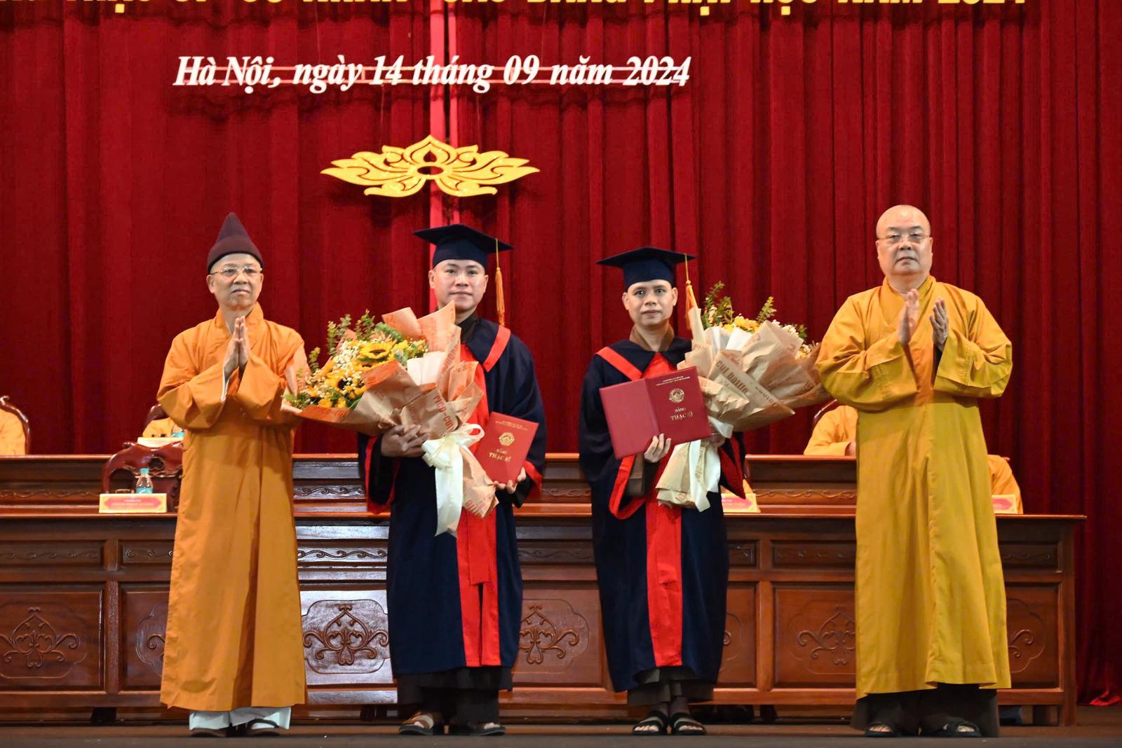 Cũng tại buổi lễ, Học viện công nhận học vị và cấp bằng thạc sỹ cho 2 học viên hoàn thành chương trình đào tạo ngành Phật học; công nhận kết quả tốt nghiệp hệ cử nhân Phật học, lớp hệ liên thông khóa 3 cho 27 vị; lớp cao đẳng Phật học khóa 6 niên khóa 2020 -2024 đối với 10 vị và tặng bằng khen cho 8 tăng ni sinh.