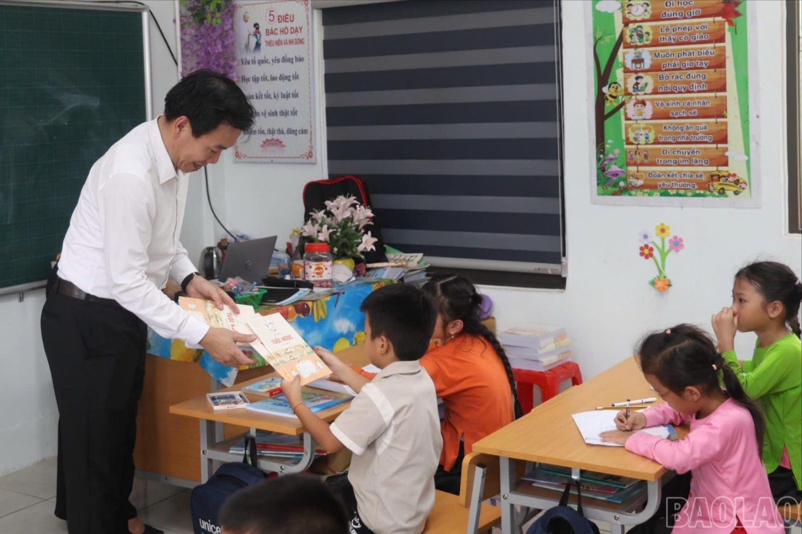 Ông Dương Đức Huy, Trưởng Ban Tuyên giáo và Dân vận Tỉnh ủy Lào Cai tặng quà các gia đình và động viên học sinh thôn Làng Nủ, xã Phúc Khánh. Ảnh: Báo Lào Cai