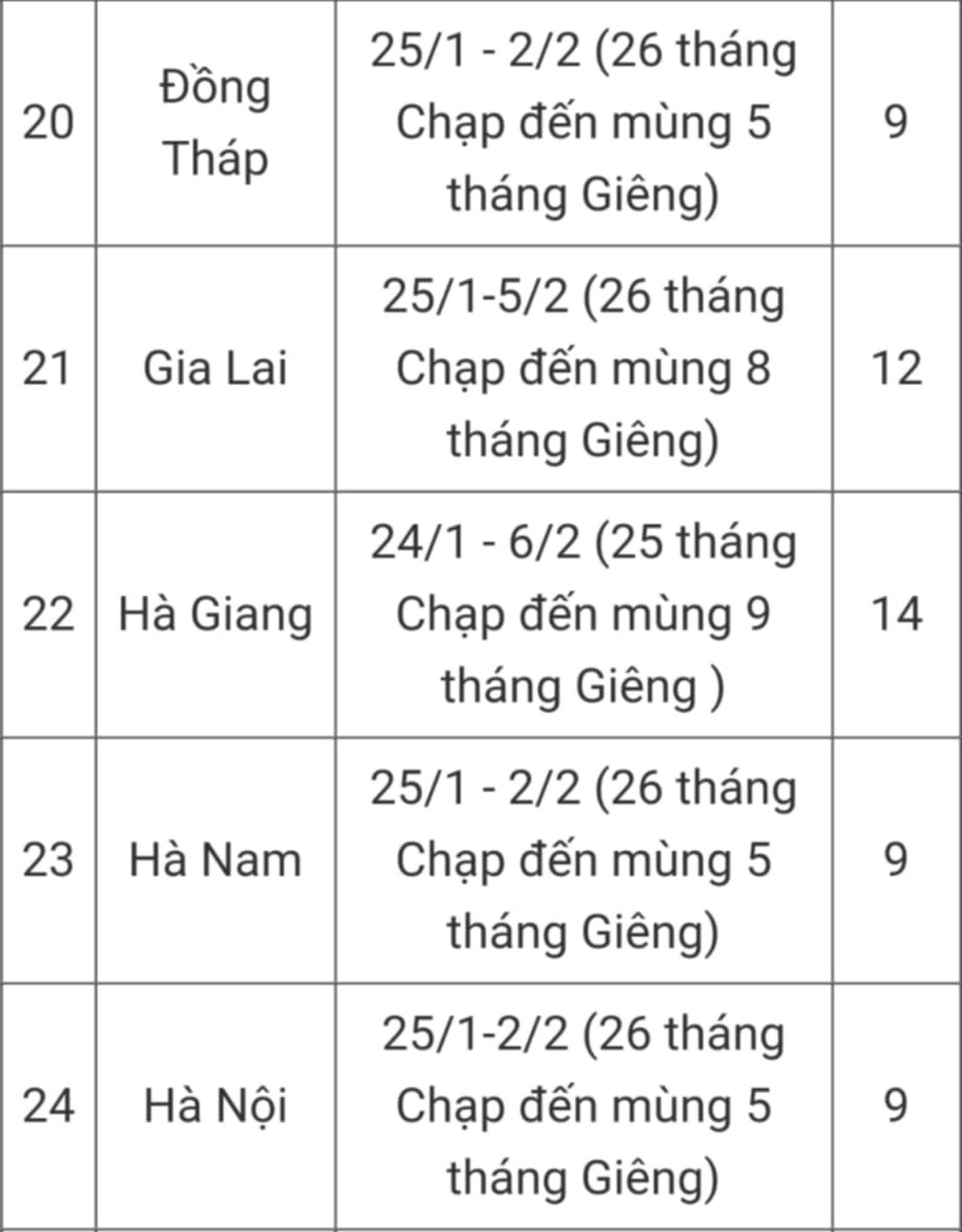 Như vậy, học sinh Kon Tum được nghỉ Tết Nguyên đán 2025 dài nhất cả nước, lên đến 17 ngày (tính cả ngày cuối tuần). Còn các tỉnh cho học sinh nghỉ Tết nguyên đán Ất Tỵ 2025 ít nhất chỉ 9 ngày, trong đó có Thủ đô Hà Nội.