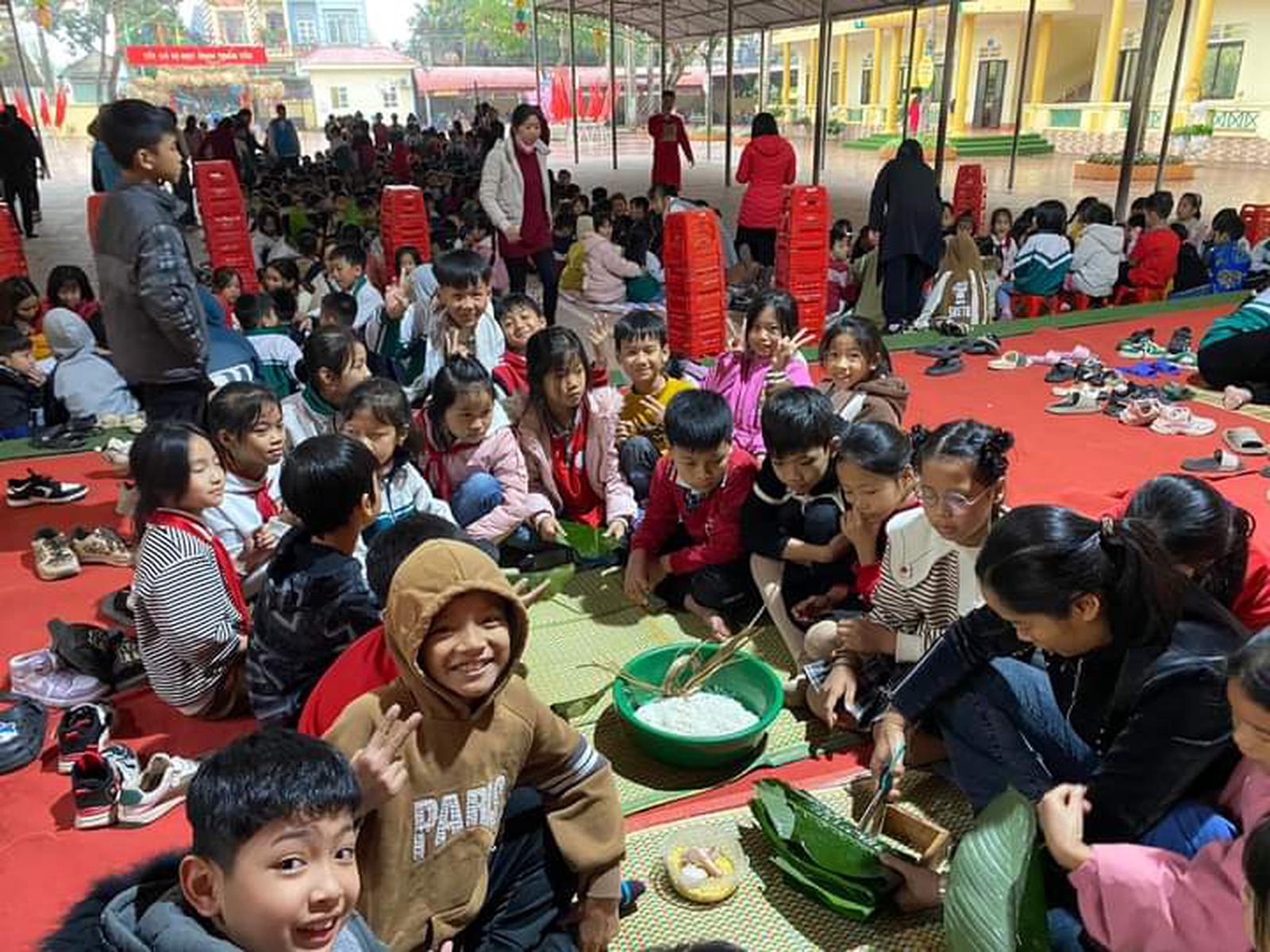 Học sinh Trường Tiểu học Tứ Xã, Lâm Thao, Phú Thọ trải nghiệm gói bánh chưng ngày 22/1/2024. Ảnh: Trần Thắng